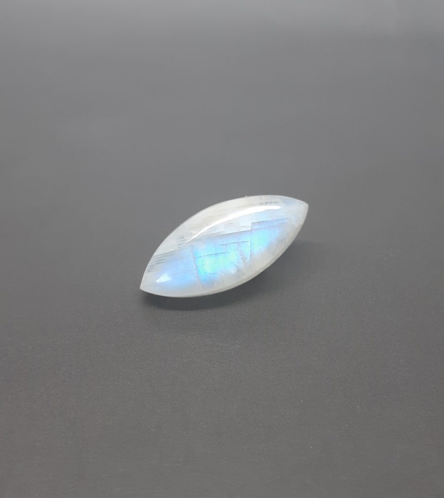 Cette pierre de naissance est d’un blanc laiteux avec des reflets bleutés quand on bouge la pierre, elle peut aussi être facilement confondue avec la labradorite blanche