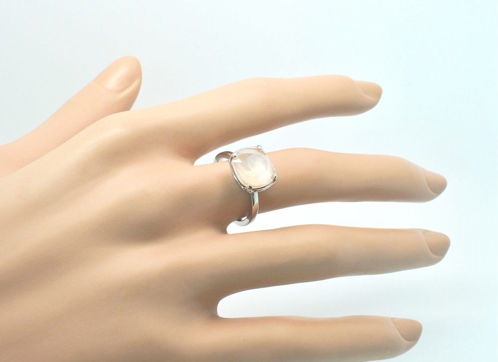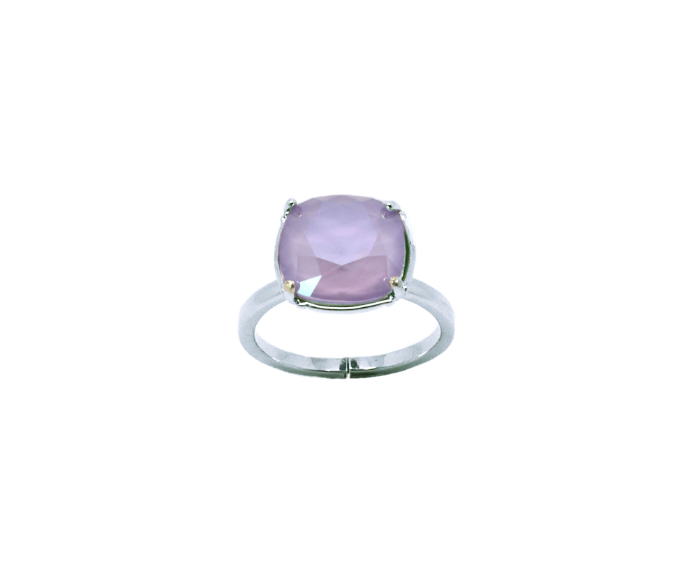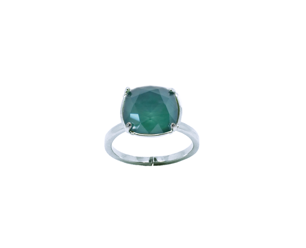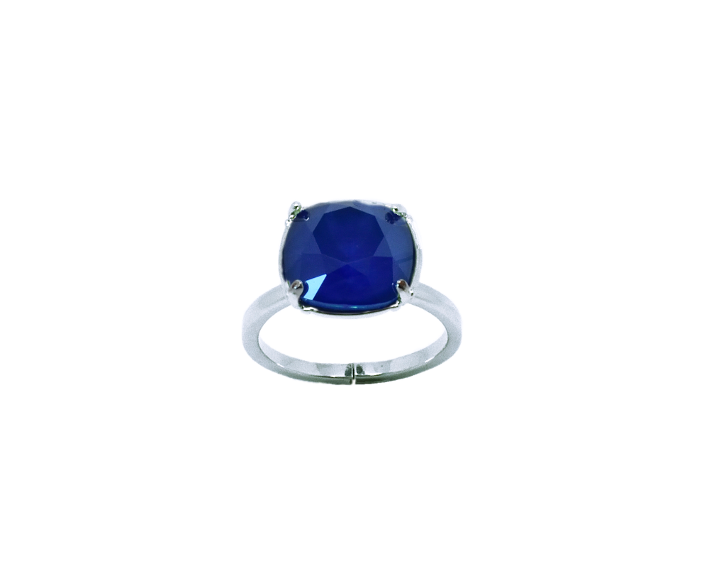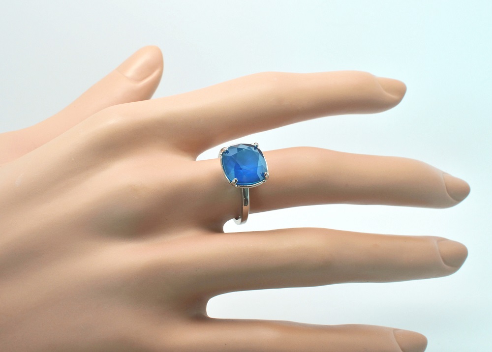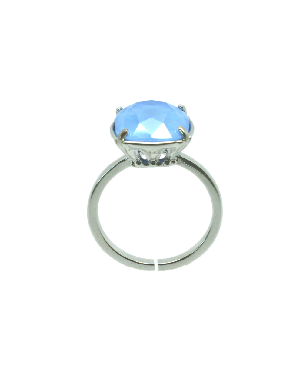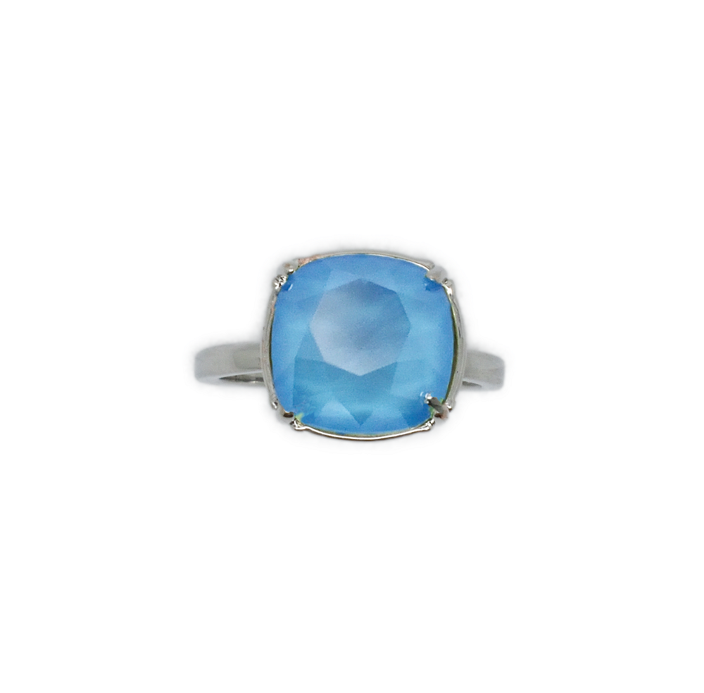 Bague Dorian en rhodié et sertie d’un cabochon en cristal Swarovski carré de 10 mm de couleur crystal color ici crystal summer blue (bleu ciel).