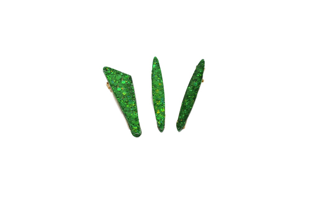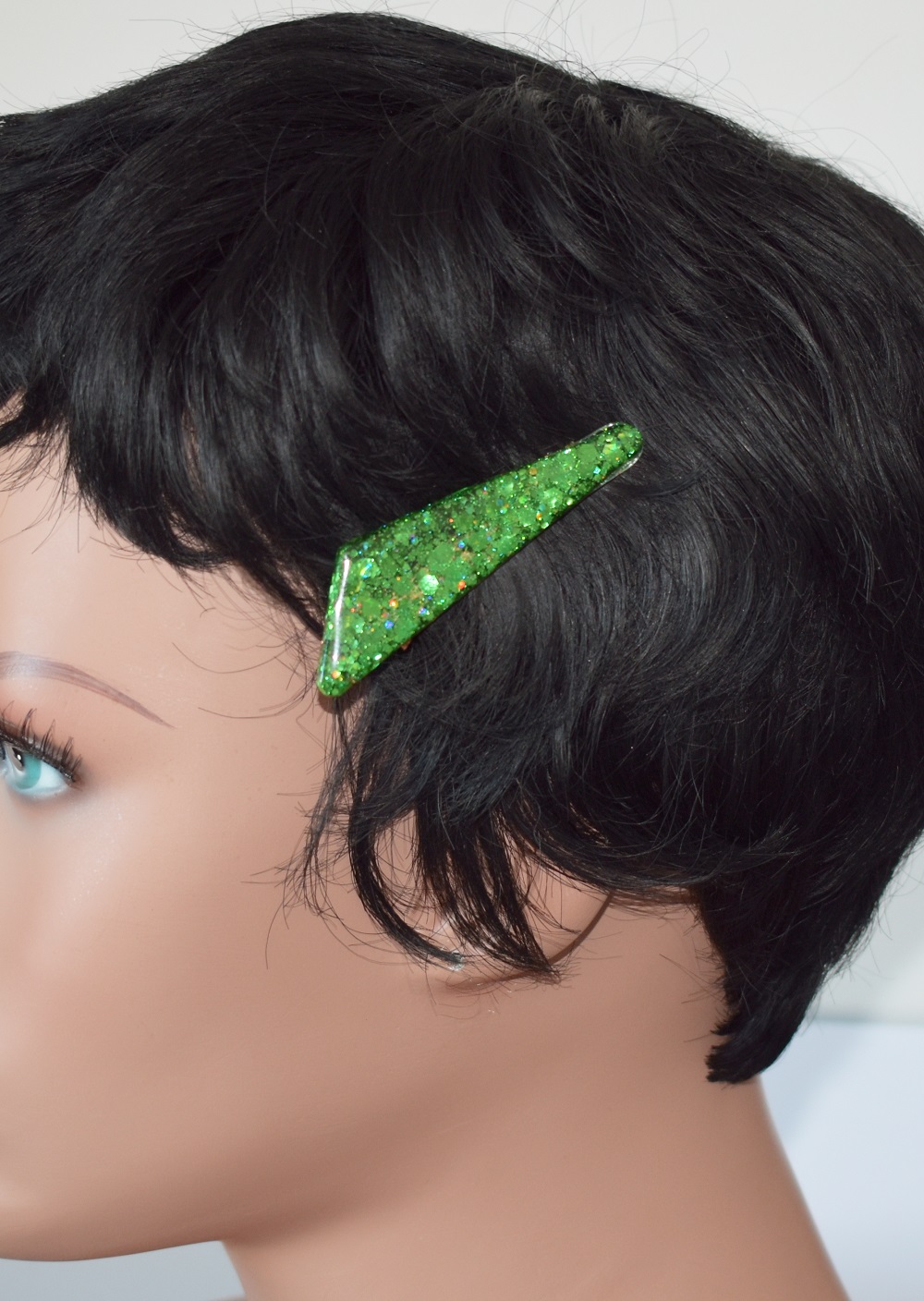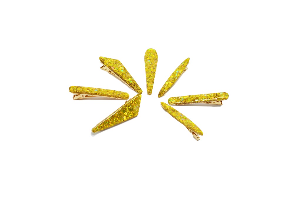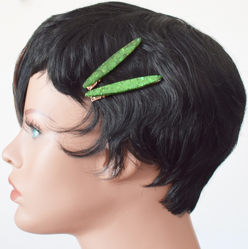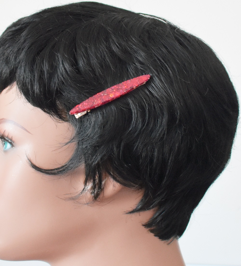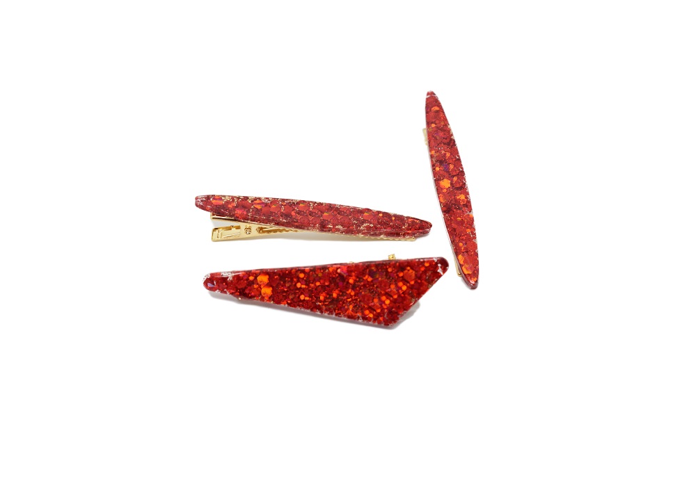 Barrette résine fête de Noël, avec inclusion de paillettes aux couleurs pétillantes aux couleurs de Noël. Ces barrettes sont en forme pince crocodile. Peut être portée sur cheveux long mais aussi sur cheveux courts. Accessoire élégant et à chaque fois unique car fait main, qui mettra à coup sûr votre coiffure en valeur. N’hésitez pas à les accumuler. Différentes formes existent.