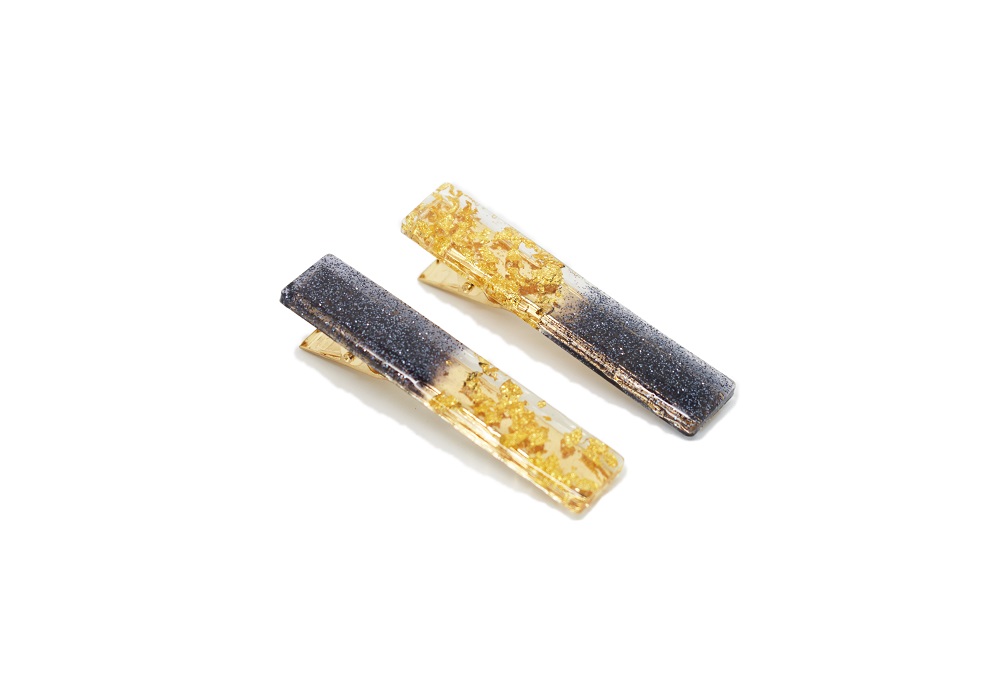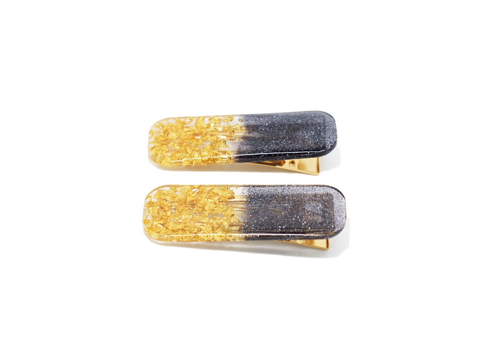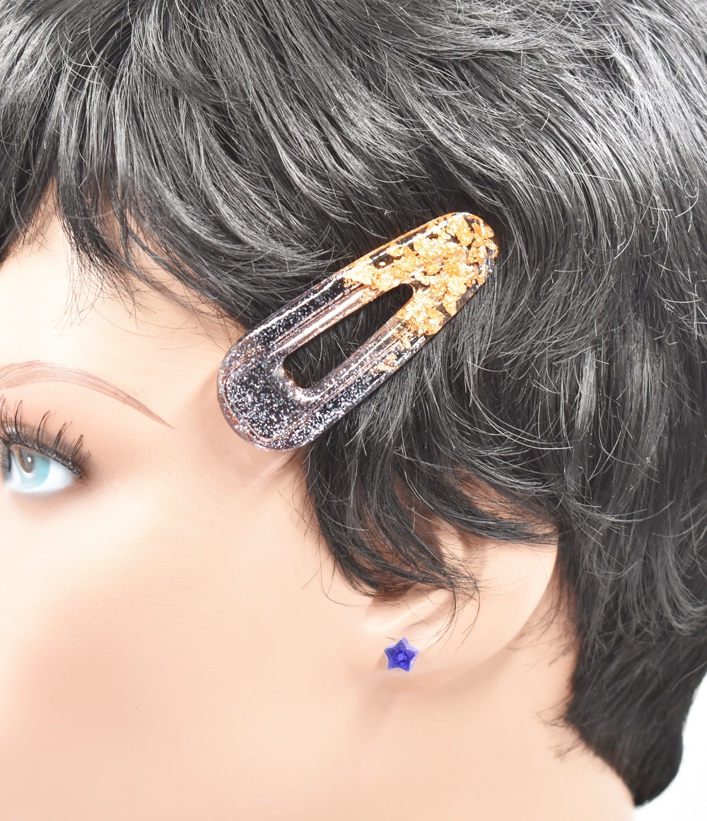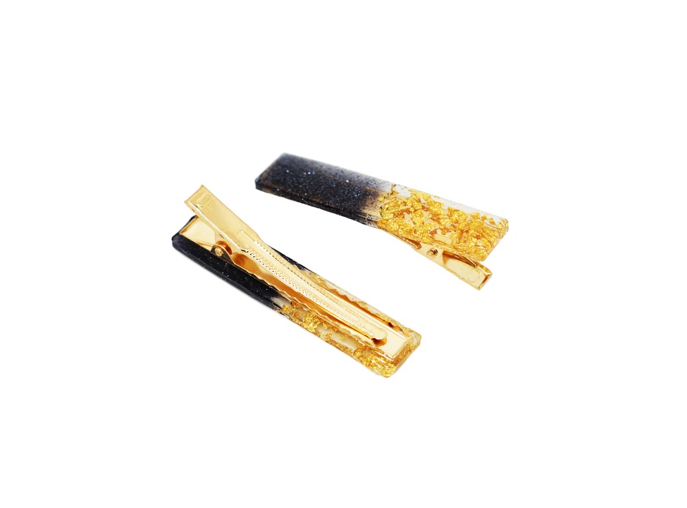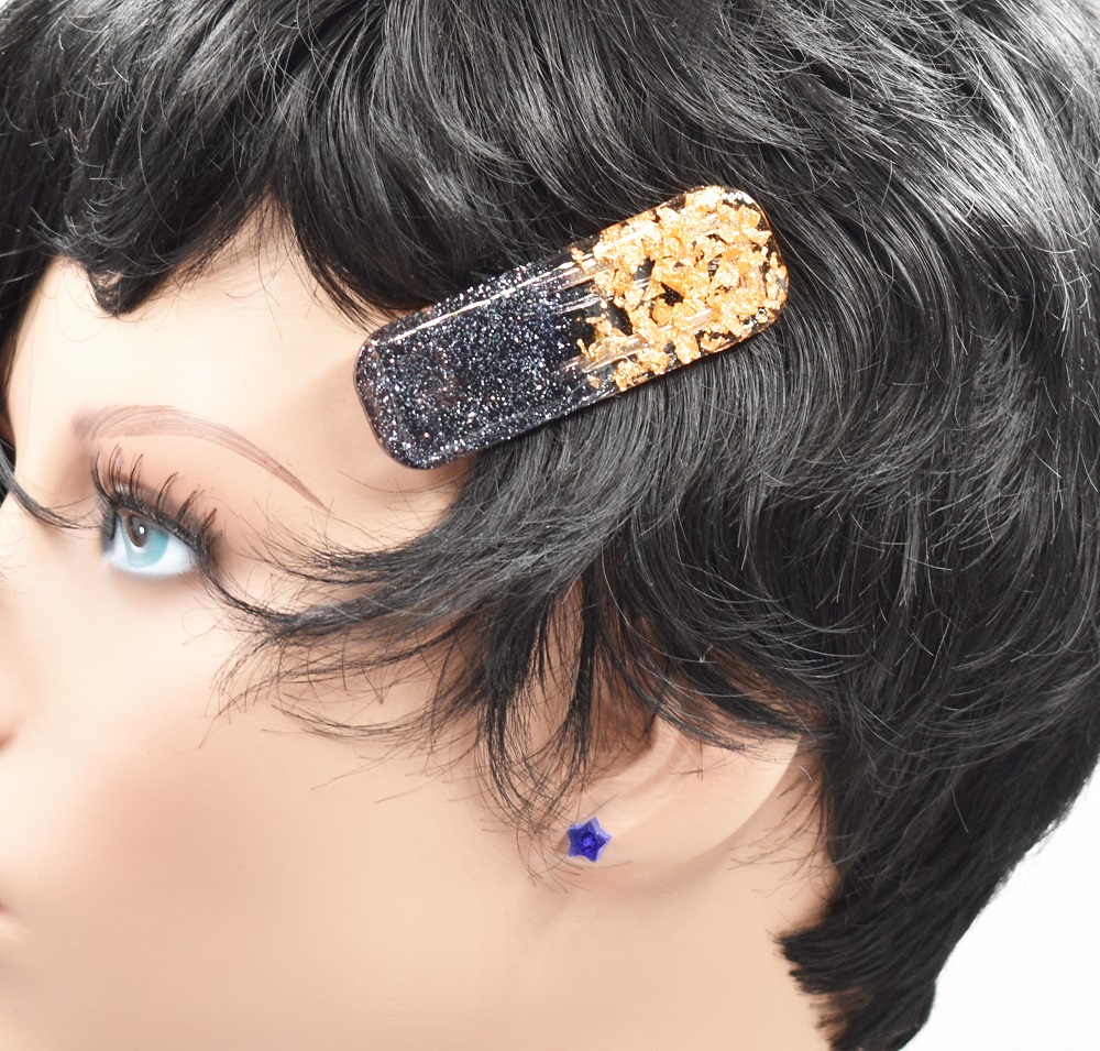 Barrettes cheveux résine noir et or, avec inclusion de copeaux de feuilles d’or et  paillettes noires, aussi bien pour cheveux courts que cheveux longs. Fait main, elles sont toutes différentes, de style pince crocodile – voir photos face profil.