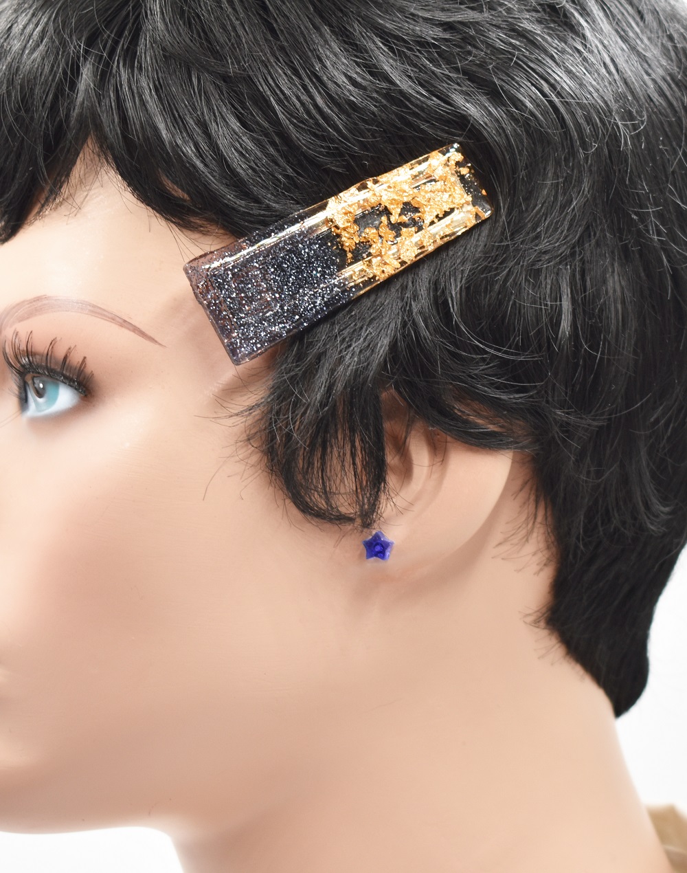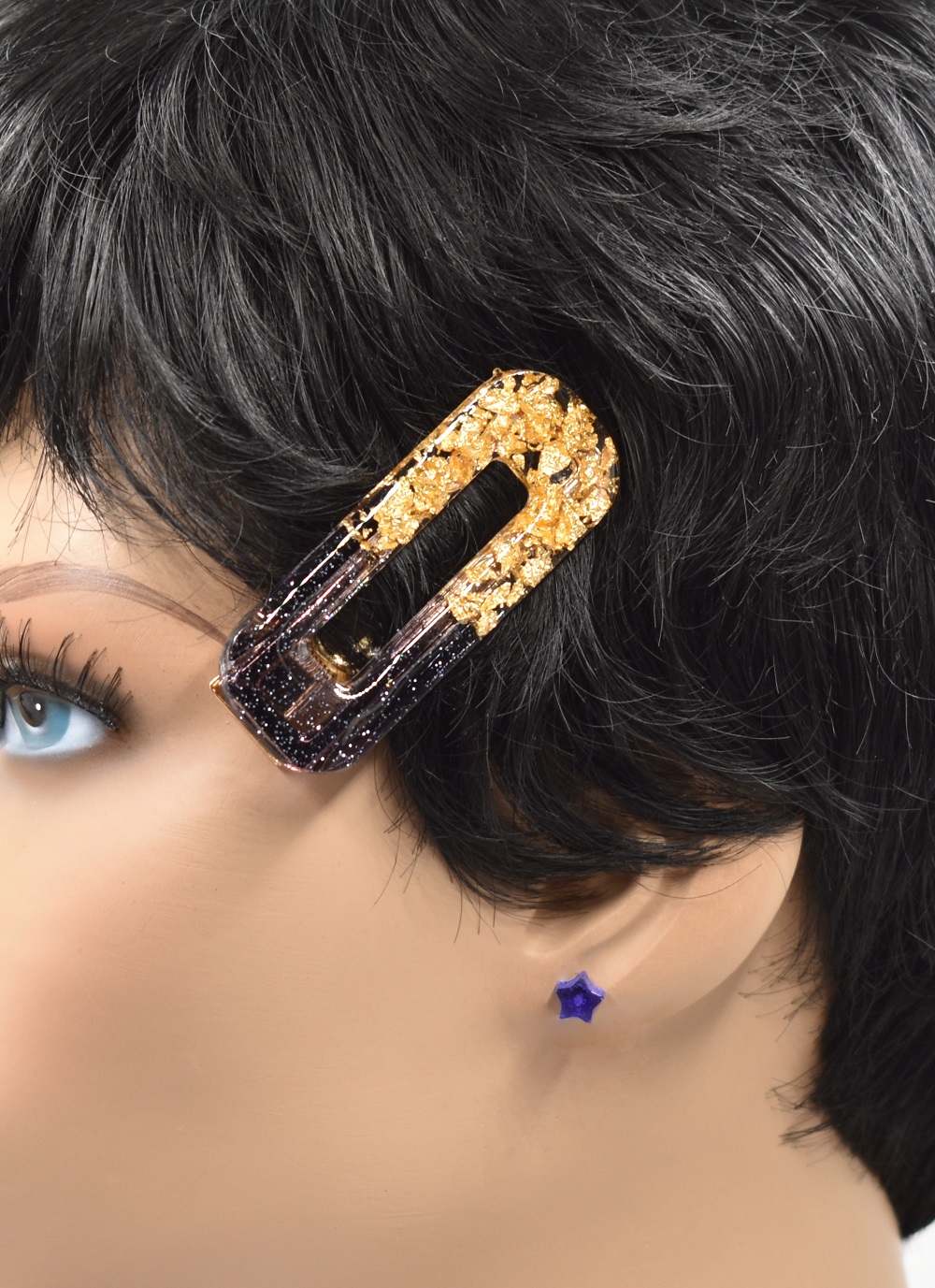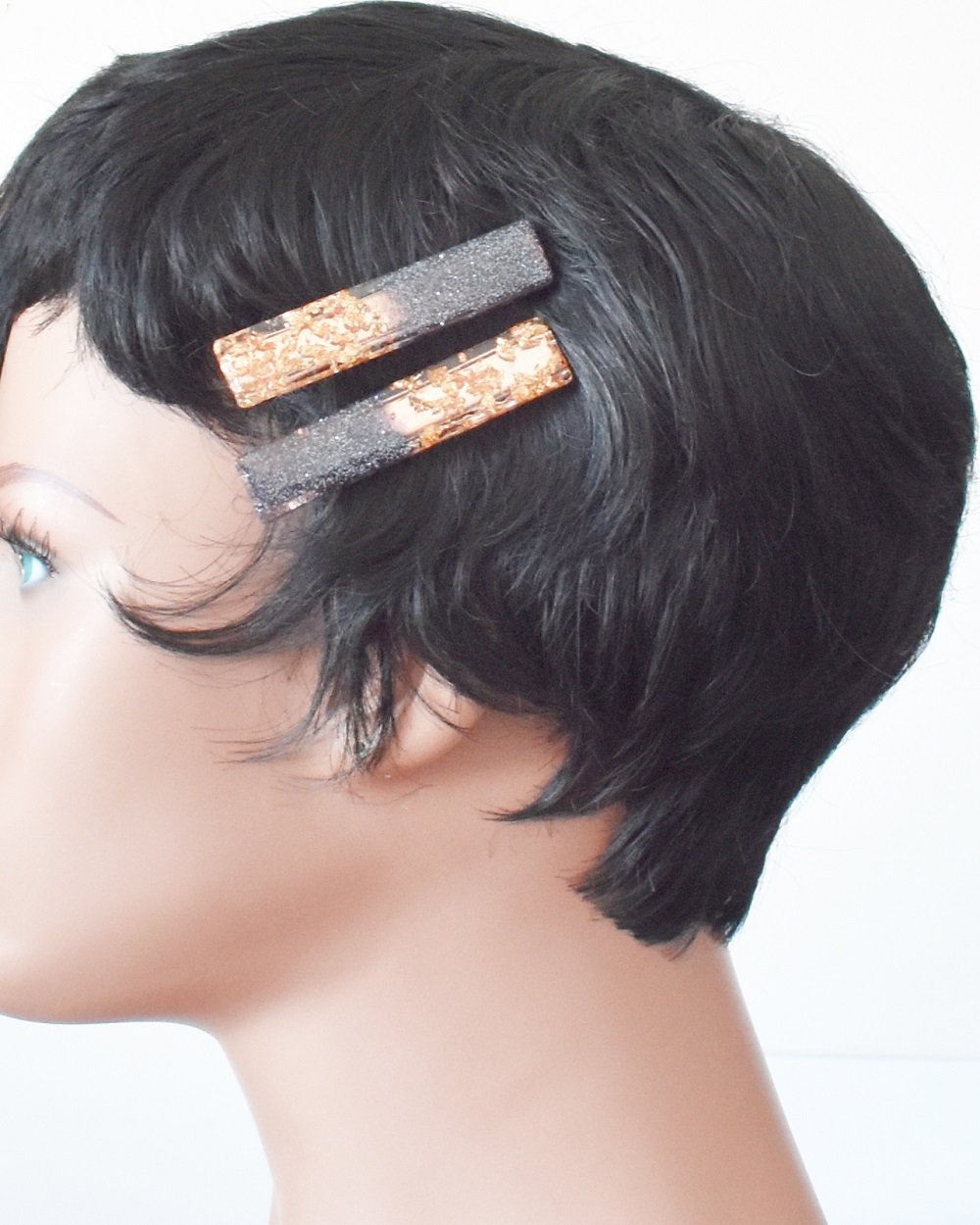 Barrettes cheveux résine noir et or, avec inclusion de copeaux de feuilles d’or et  paillettes noires, aussi bien pour cheveux courts que cheveux longs. Fait main, elles sont toutes différentes, de style pince crocodile – voir photos face profil.