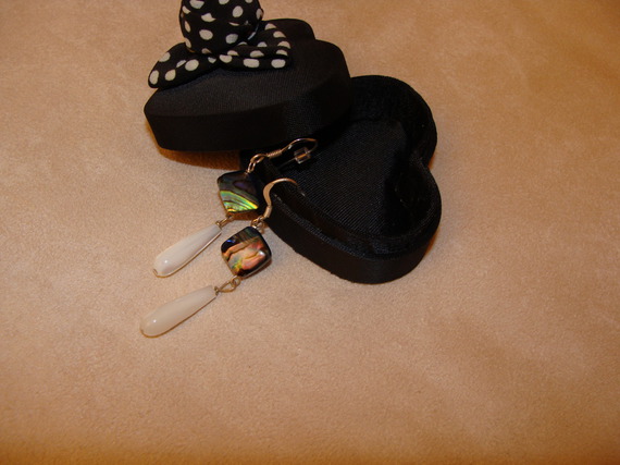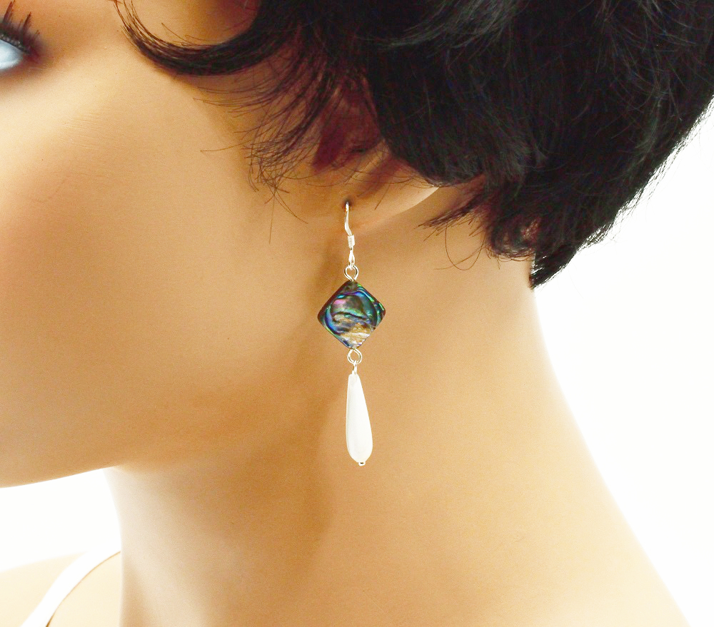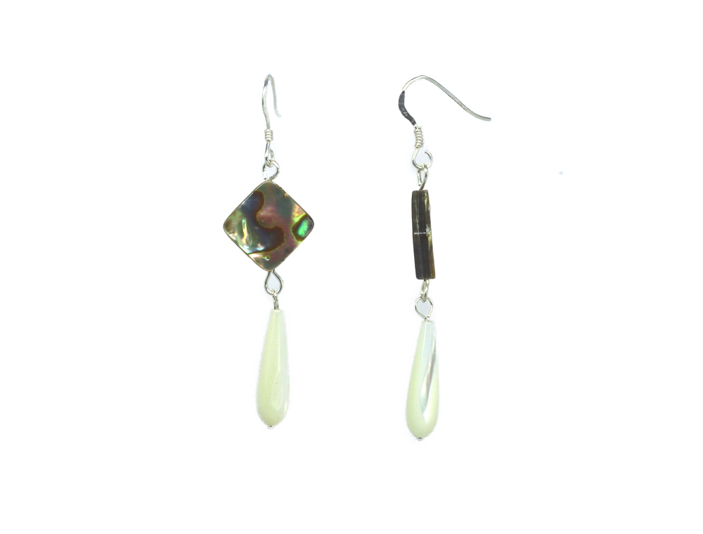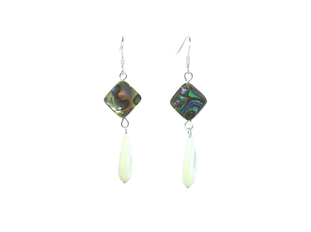 Boucles d’oreilles crochets argentés et perle en abalone carrée percée en diagonal terminée par une goutte de nacre fine d’une très grande qualité.