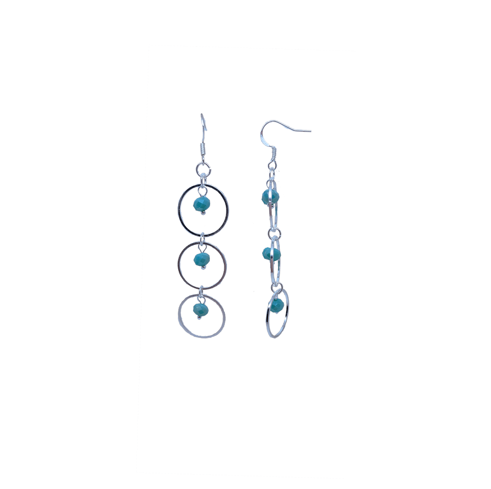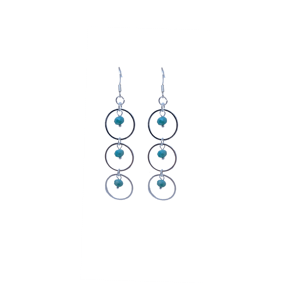 Boucles d’oreilles argentées trois anneaux. Chaque anneau supporte une jolie perles ovales à facette de couleur opaque.