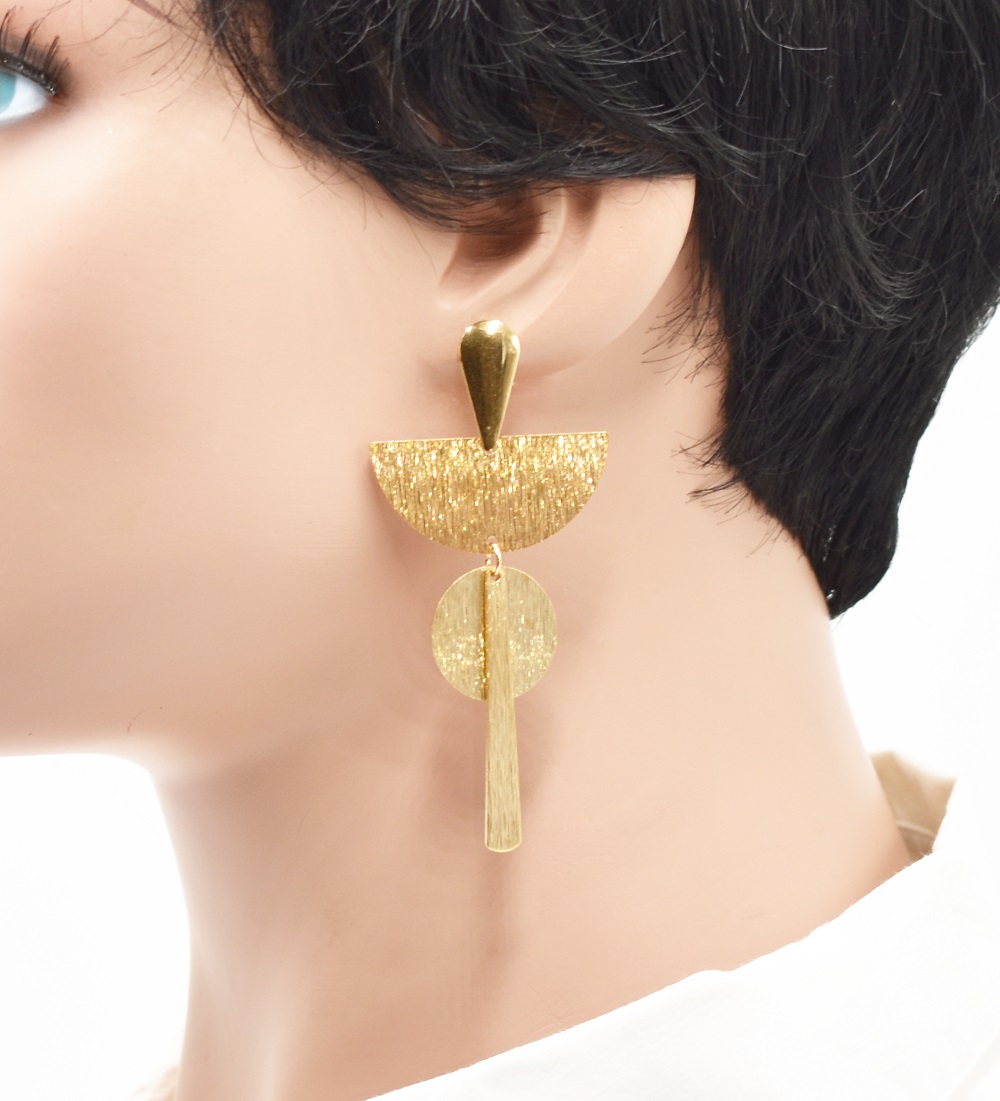 Boucles d’oreilles clous géométriques. Ces boucles d’oreilles font parties de la collection géométrique. Très originales, avec un mélange de matières et aussi de formes. Un mariage de matériaux tel que l’acier ainsi que de laiton texturé doré. Des jeux de lumières avec les formes texturées et les formes lisses, ne laisseront personnes indifférents.