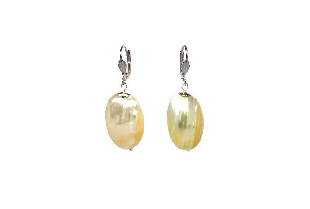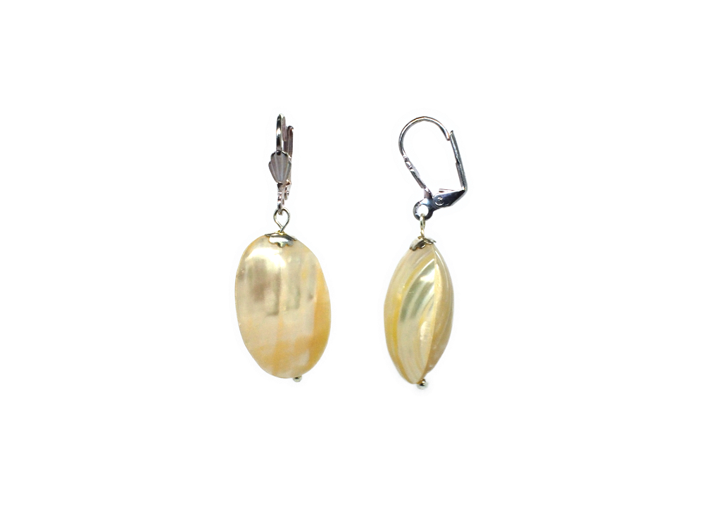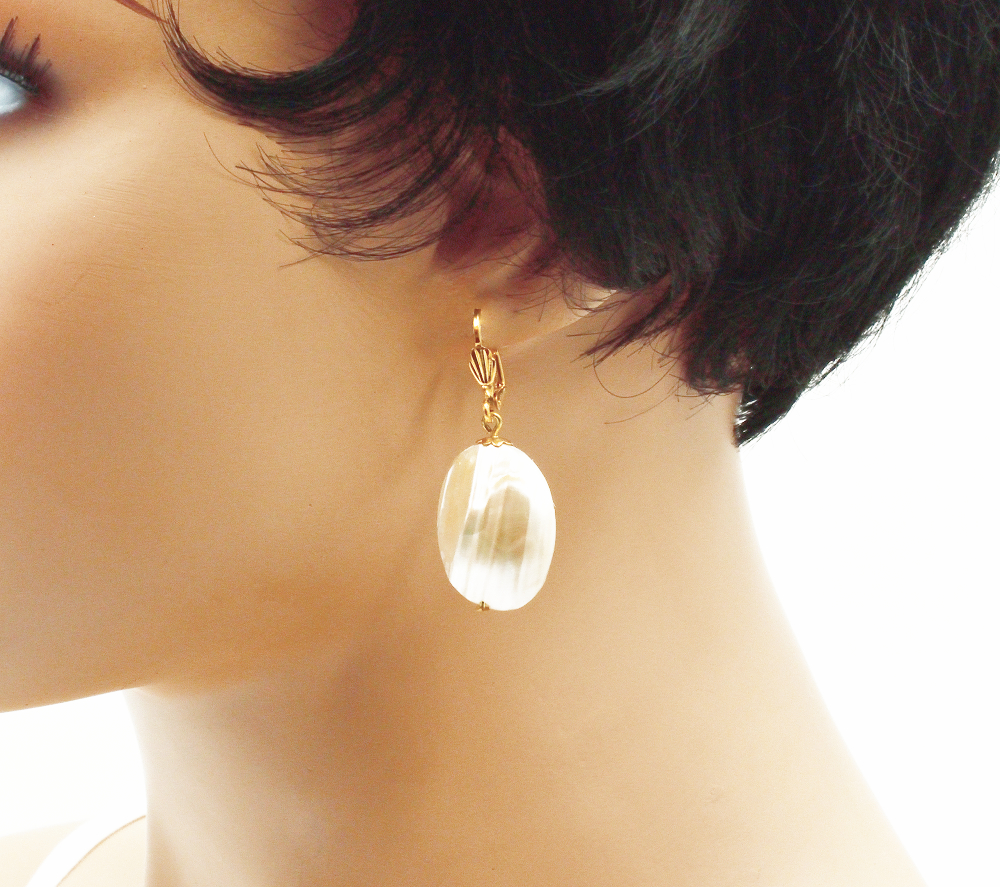 Dormeuse pendantes argentées ou dorées (exemple sur le modèle de profil) sans nickel et coquille de nacre de très grande qualité couleur vanille irisé.