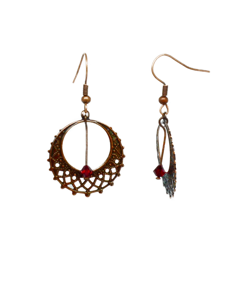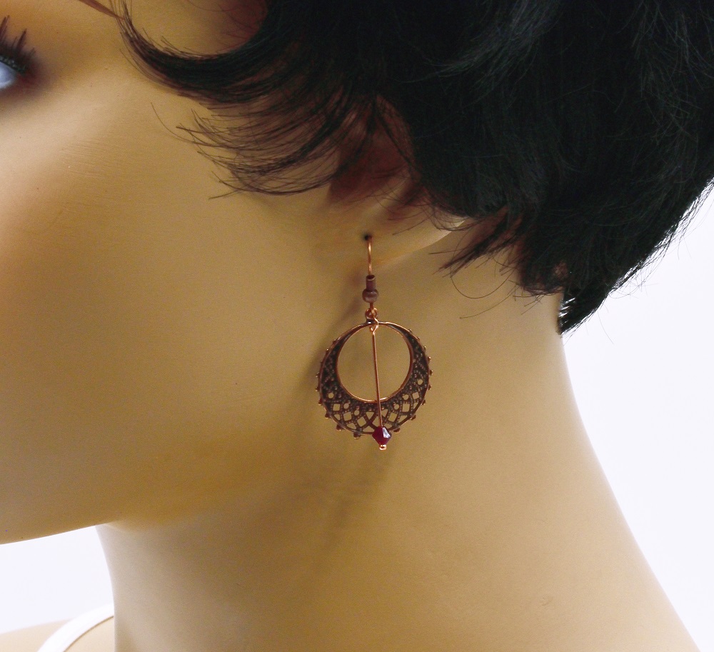 Très fines et légères boucles d’oreilles composées de chandeliers rond couleur cuivre antique et de perles Swarovski ici de couleur rouge.