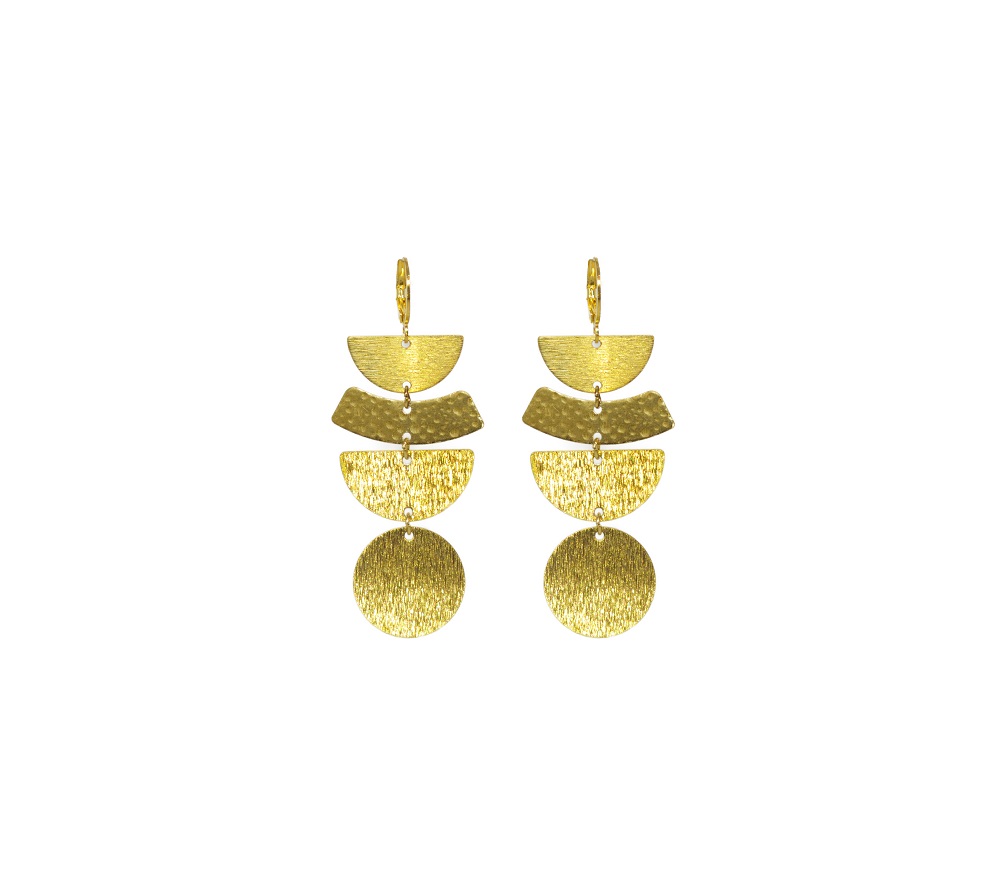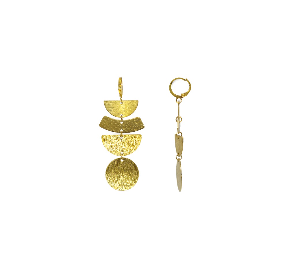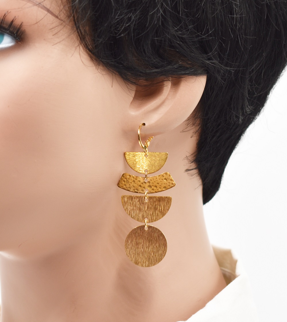 Les pièces de laiton structurées de différentes formes qui attirent les rayons du soleil et de petites créoles en acier. Ici dans les tons or.