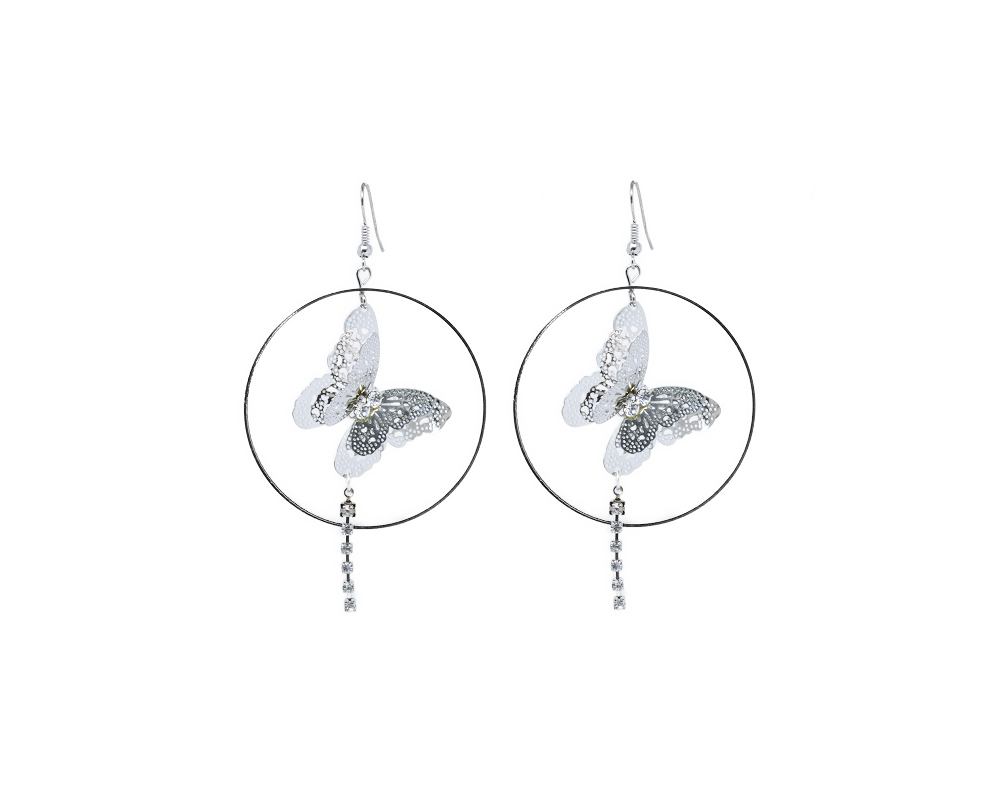 Boucles d’oreilles créoles papillons argentées.
