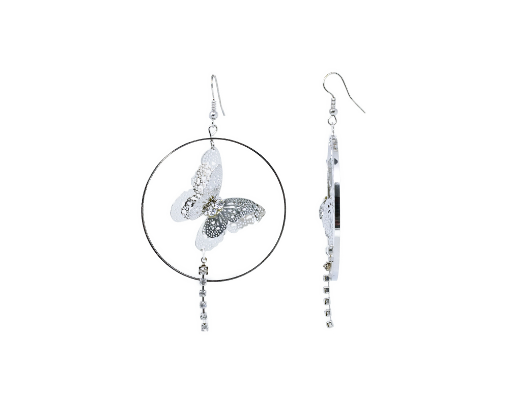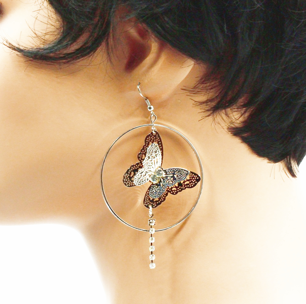 Boucles d’oreilles créoles papillons doubles en filigrane, très légères en acier avec de petits strass.
