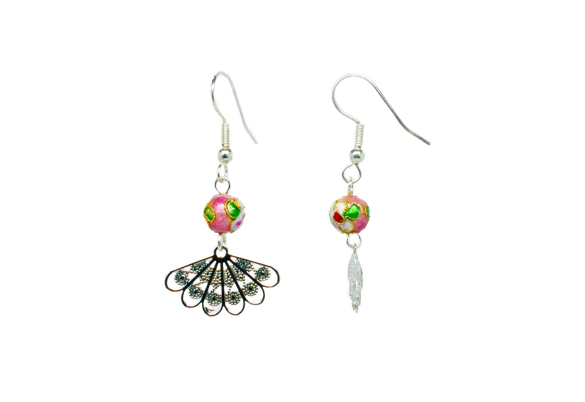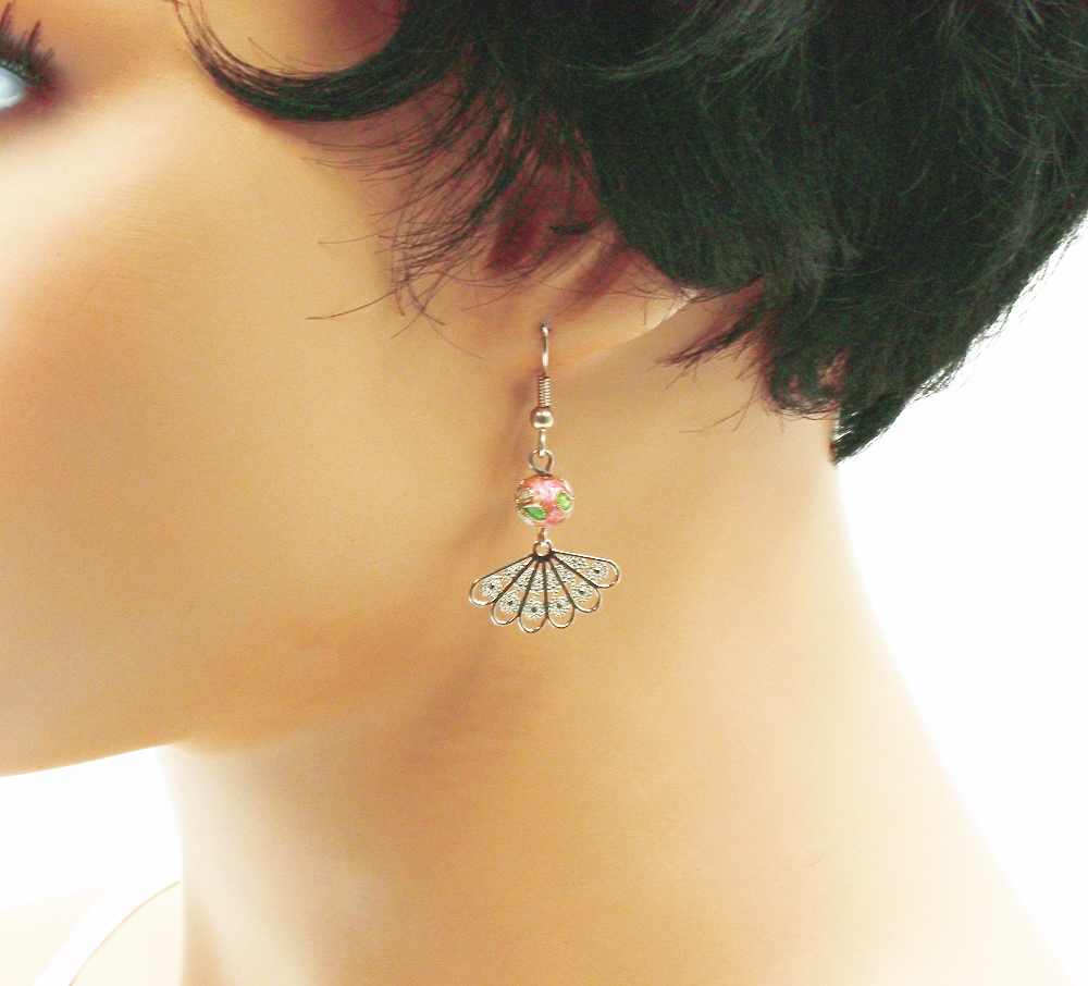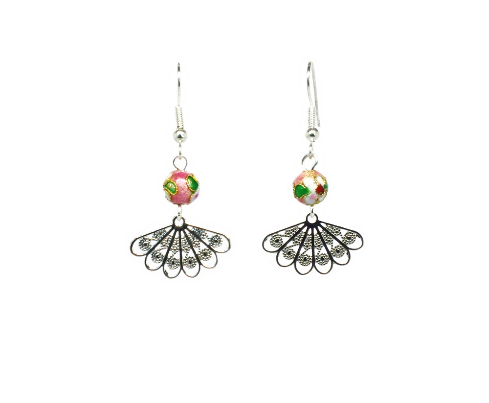 Boucles d’oreilles éventail émaille. Un petit air d’Asie avec une estampe très fine en forme d’éventail ainsi que de jolies perles cloisonnées roses. Un peu d’évasion à vos oreilles.