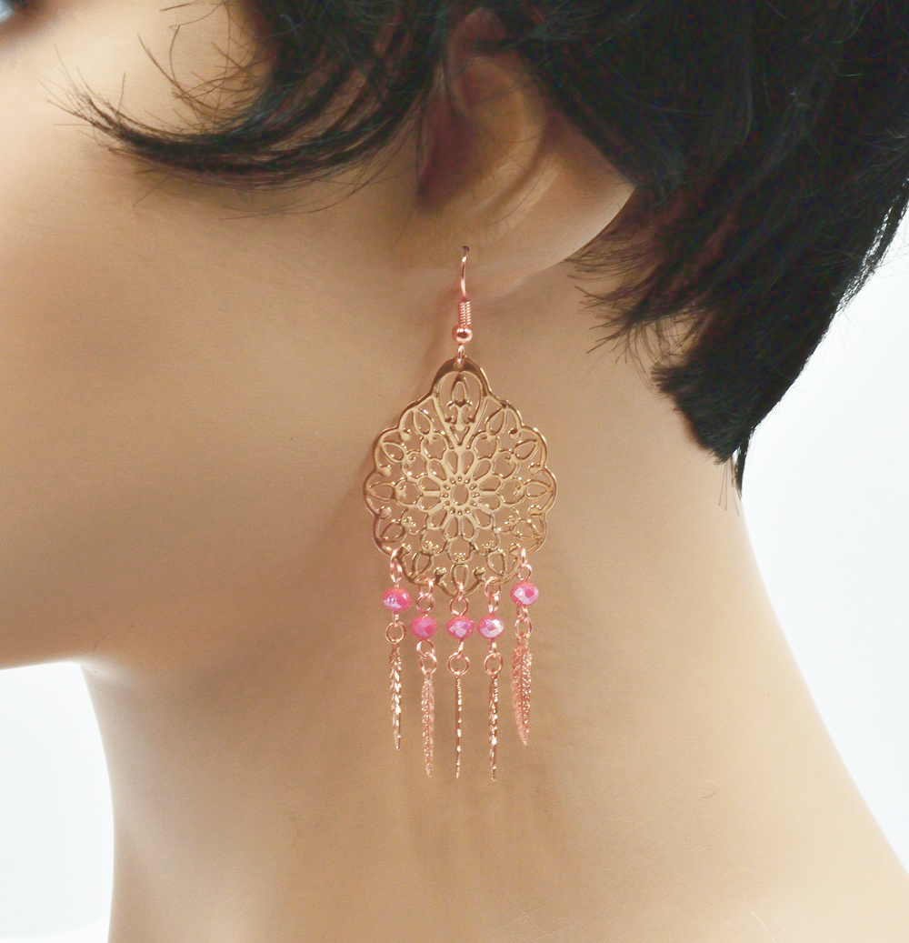 Boucles d’oreilles filigrane or rose avec un magnifique chandelier fin. De joli perles ovales à facettes rouge et de petits plumes. Elles rappellent les attrapent rêves.