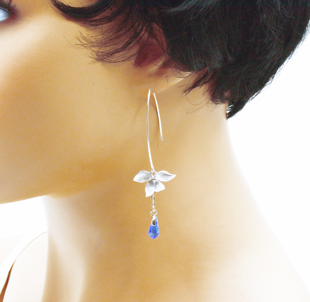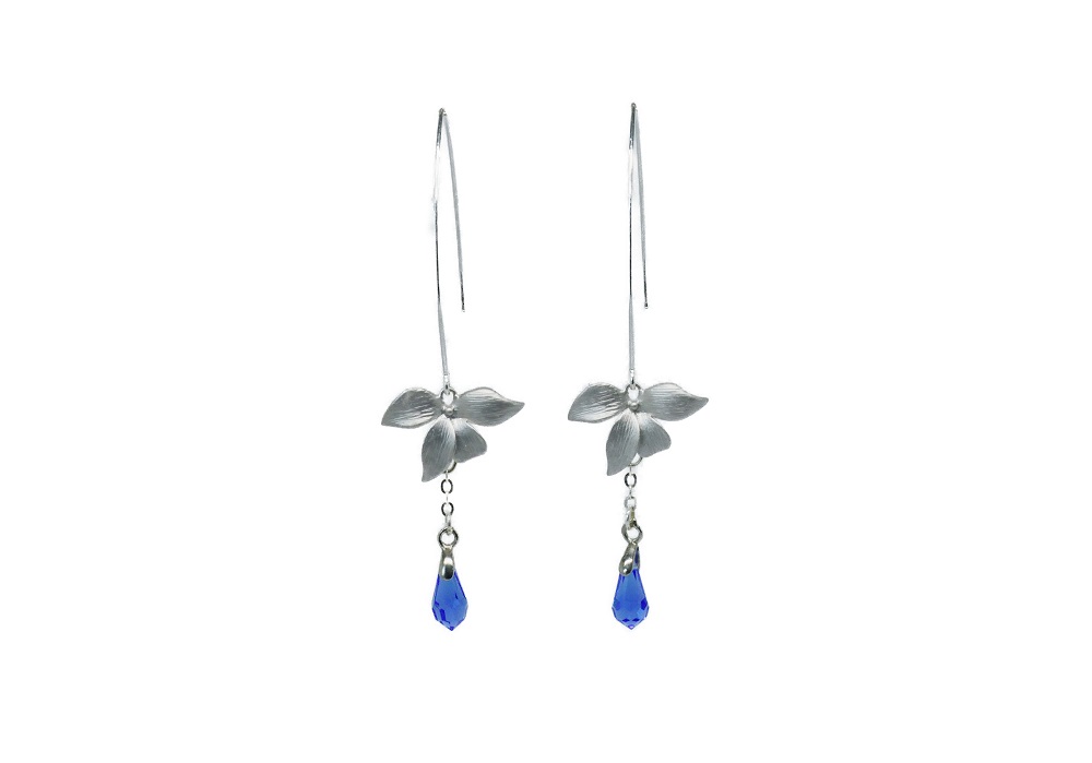 Boucles d’oreilles fleur d’orchidée. Grand crochet d’oreille en laiton, avec une fleur d’orchidée en laiton argenté mat et une goutte en Swarovski bleu saphir. En édition limitée.