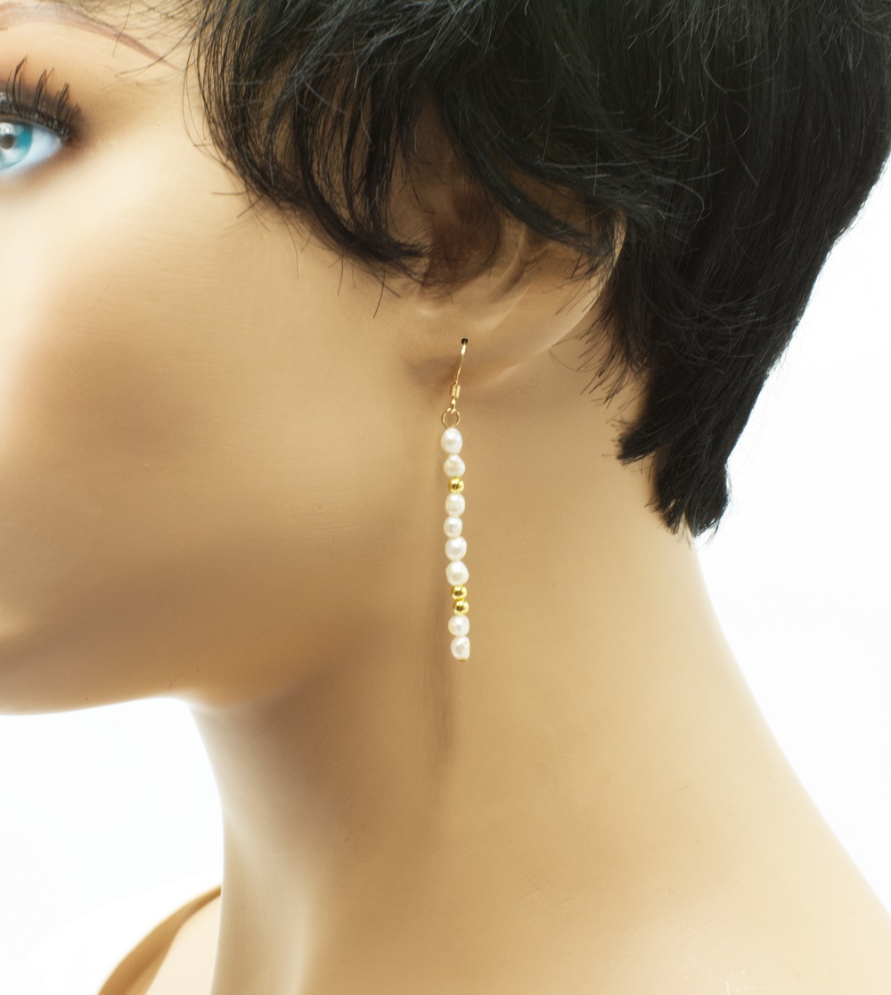 Boucles d’oreilles plaquées or, perles d’eau douce.  Ces crochets d’oreilles font aussi parties de la collection Nature. Elles sont classiques et se portent au gré de vos envies. Les boucles montées de petites perles d’eau douce ainsi que de perles plaquées or.