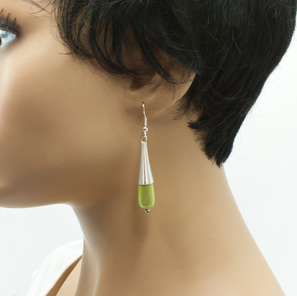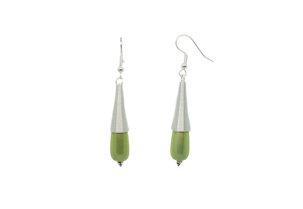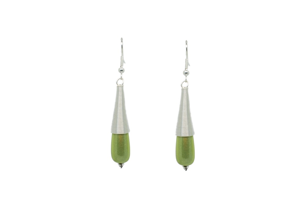 Boucles d’oreilles pendantes couleur argent, avec une spirale, petit clin d’œil aux colliers portés par certaines femmes birmanes (ancienne coutume), et une perle en forme de goutte dite magique, qui renvoi la lumière avec beaucoup d’éclat. La goutte en perle magique mesure 3 cm, ici en amande.