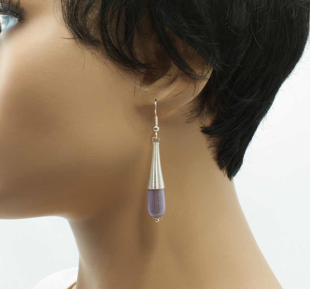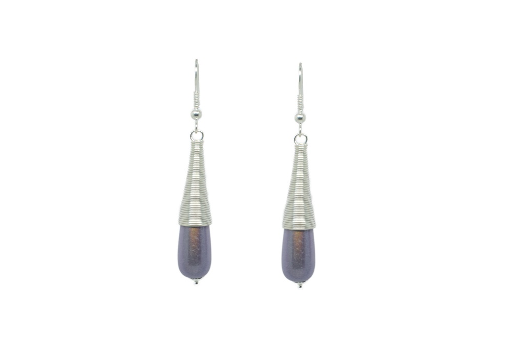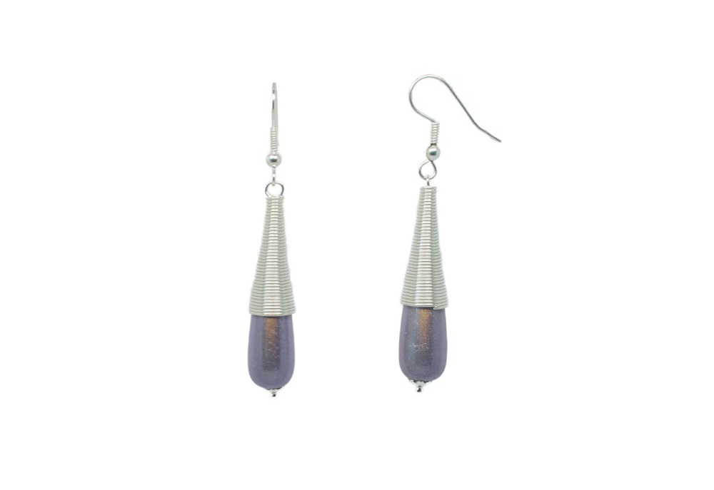Boucles d’oreilles pendantes couleur argent, avec une spirale, petit clin d’œil aux colliers portés par certaines femmes birmanes (ancienne coutume), et une perle en forme de goutte dite magique, qui renvoi la lumière avec beaucoup d’éclat. La goutte en perle magique mesure 3 cm, ici en parme.