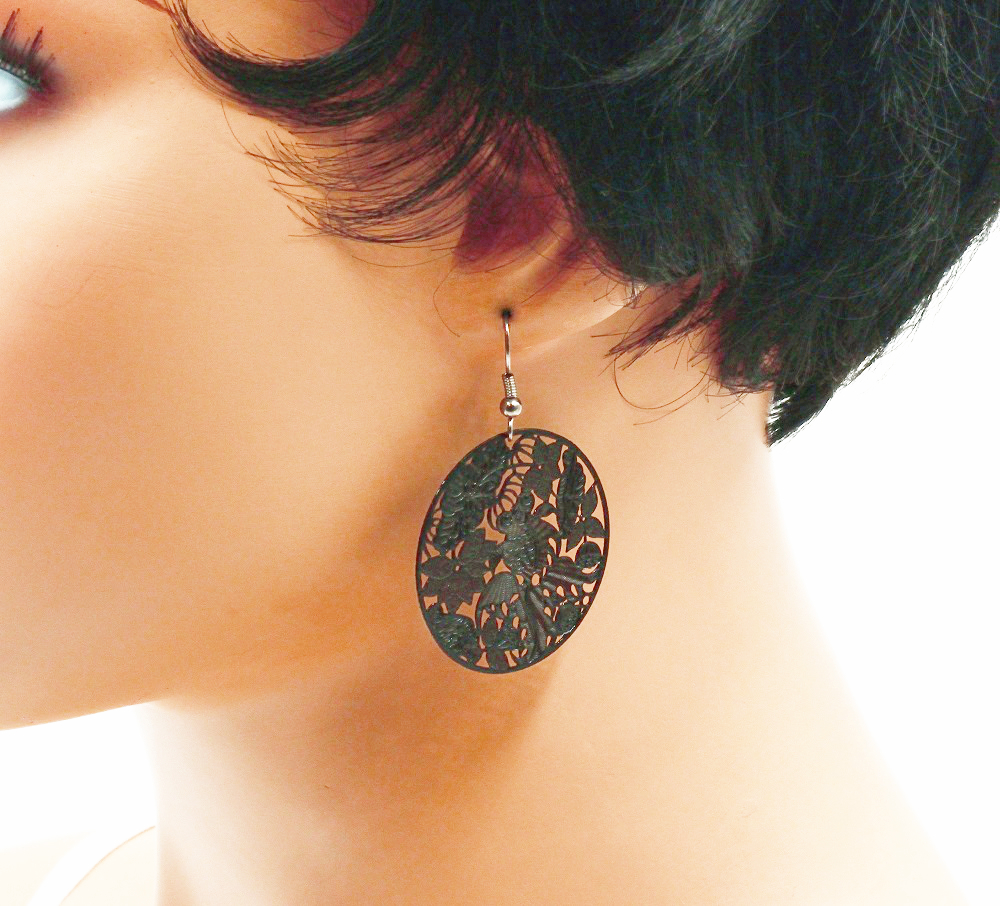 Boucles d’oreilles pendantes filigrane noire. Ce sont des estampes très fines et légères en acier émaillé noir avec un motif exotique.