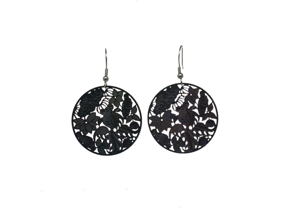 Boucles d’oreilles pendantes avec une estampe avec un motif exotique en filigrane noire de 36 mm.