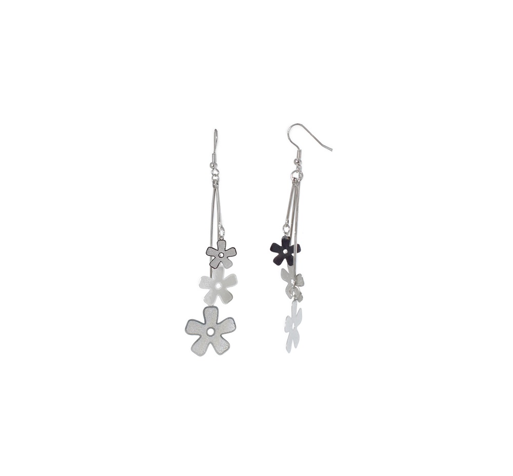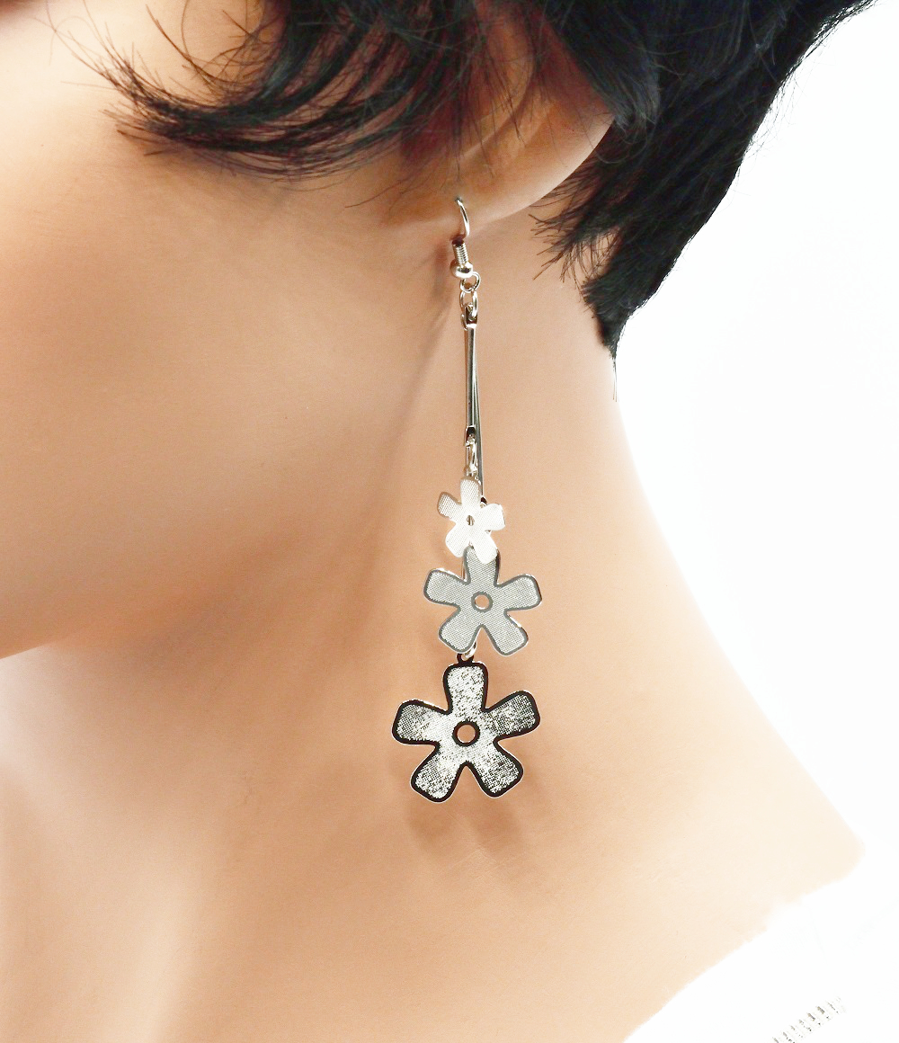 Boucles d’oreilles pendantes fleurs argentées ultra légères en acier. Crochets d’oreilles argentés avec des petites fleurs finement martelées de différentes taille.