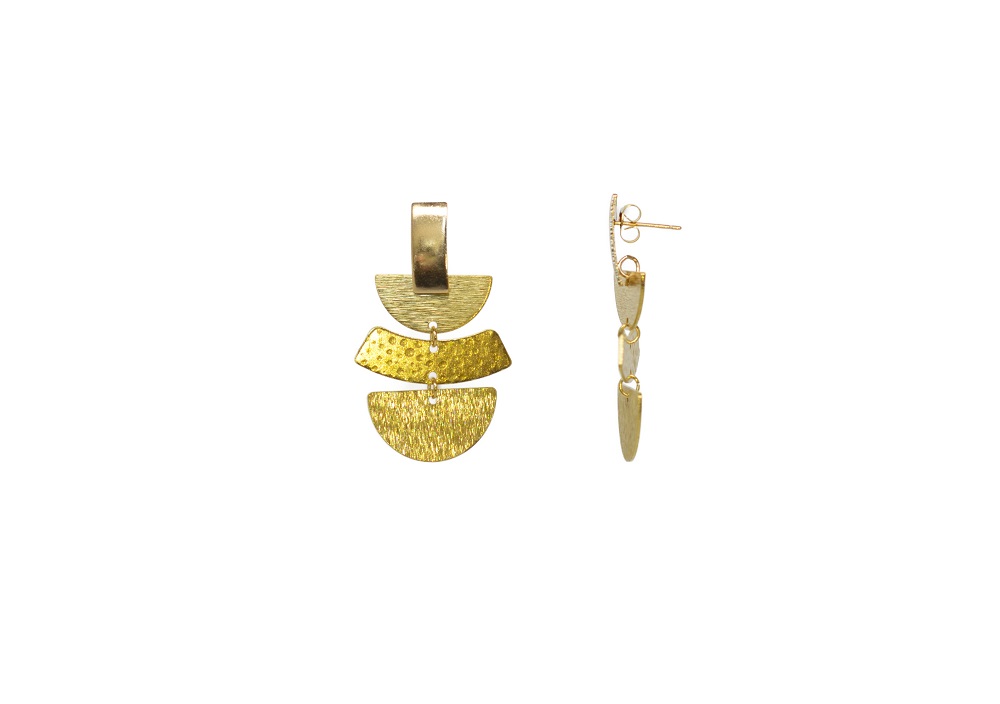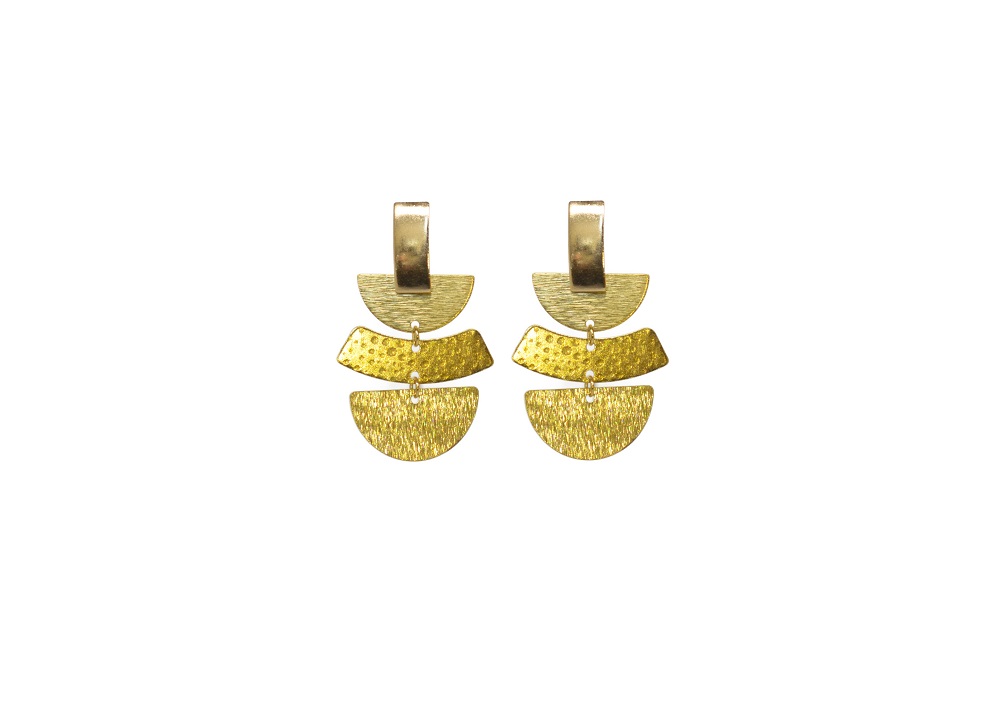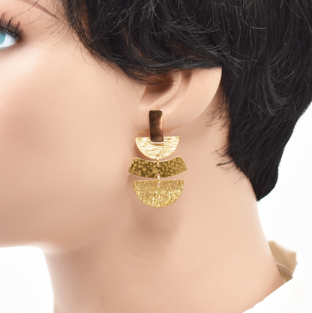 Les pièces de laiton structuré de différentes formes qui attirent les rayons du soleil et le clou d’oreilles est en acier lisse type miroir. Ici dans les tons or.