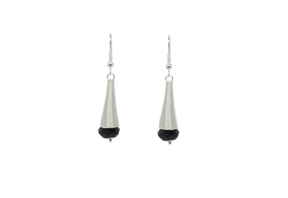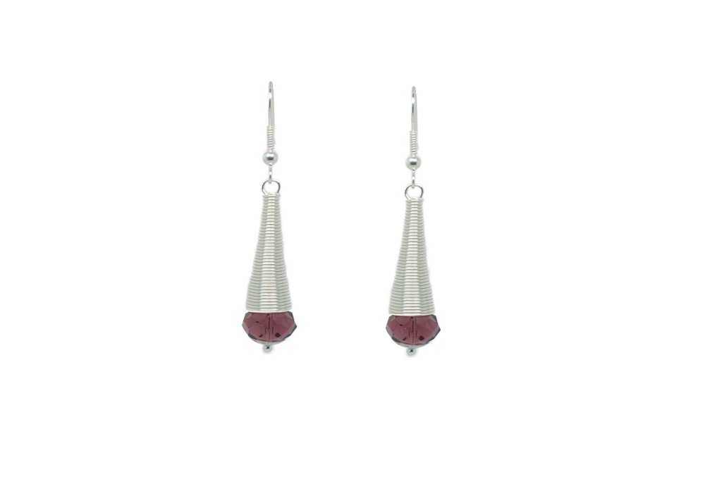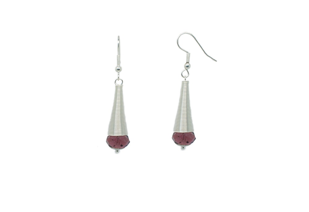 Boucles d’oreilles pendantes couleur argent, avec une spirale, petit clin d’œil aux colliers portés par certaines femmes birmanes (ancienne coutume), et une perle en verre à facettes, qui renvoi la lumière comme une boule à facettes La perle est en cristal de bohème, ici pourpre.