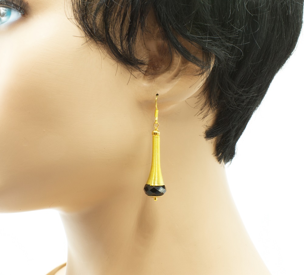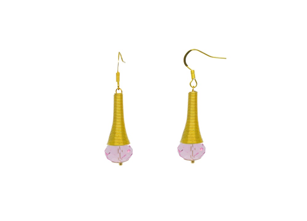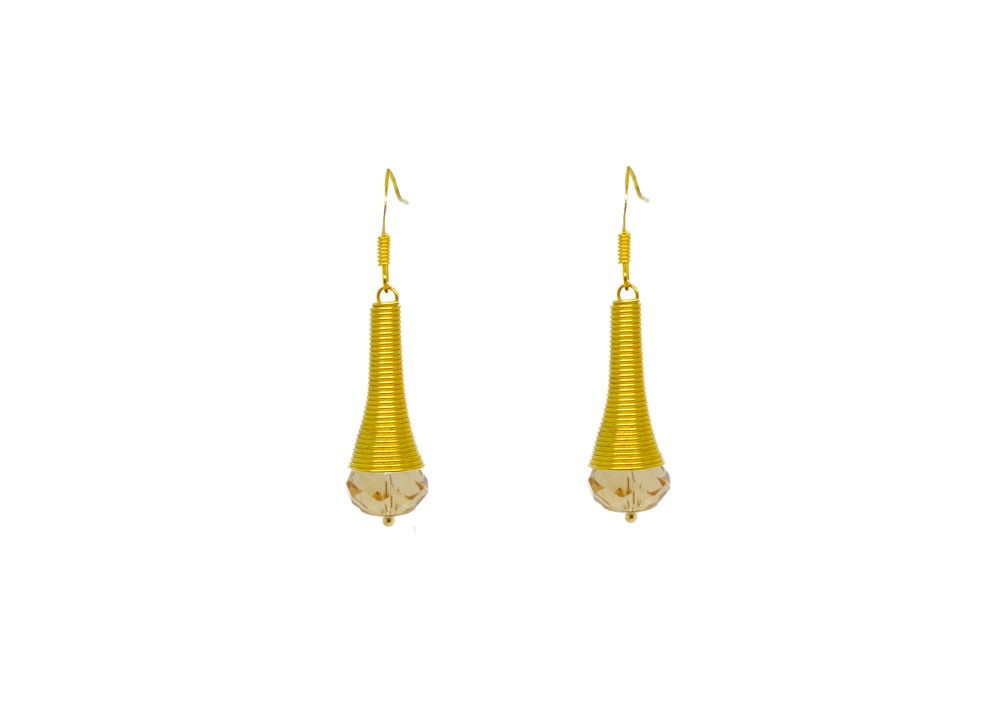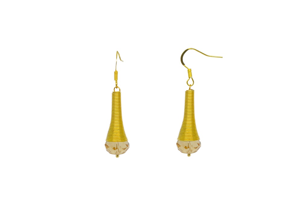 Boucles d’oreilles pendantes couleur dorée, avec une spirale, petit clin d’œil aux colliers portés par certaines femmes birmanes (ancienne coutume), et une perle en verre à facettes, qui renvoi la lumière comme une boule à facettes La perle est en cristal de bohème, ici champagne.