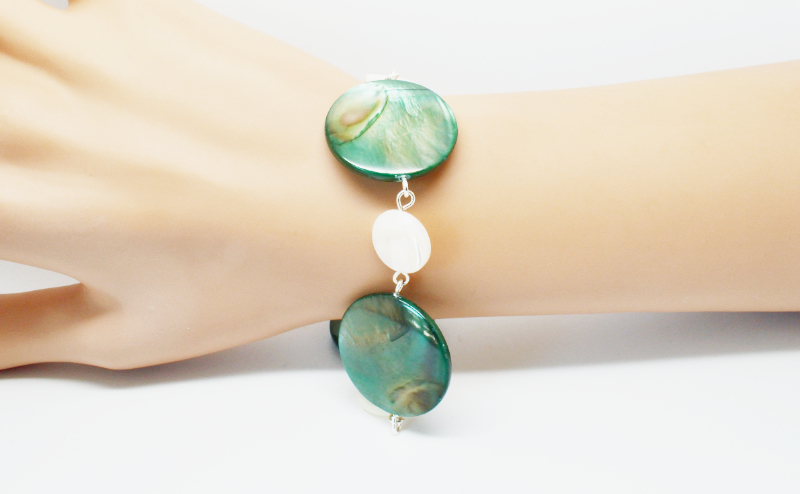 A la plage ou en ville, ce bracelet tient son originalité dans ses grandes pastilles de nacre.