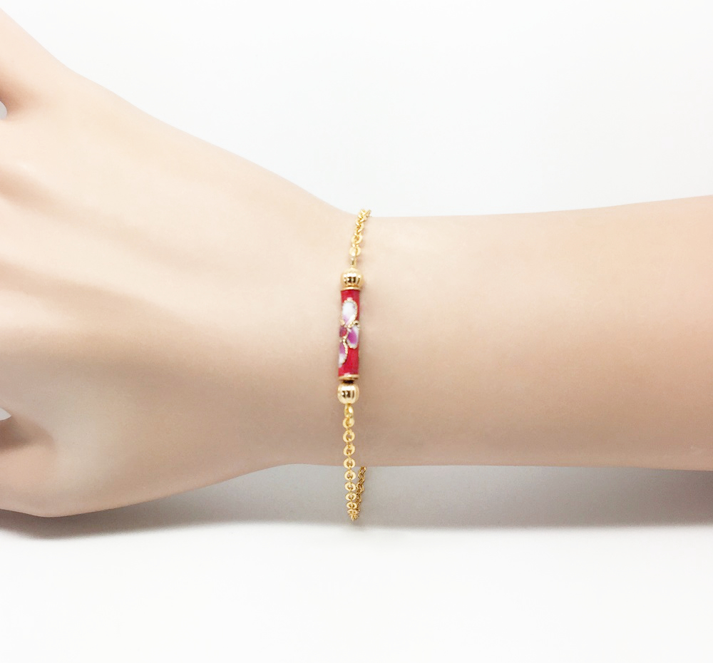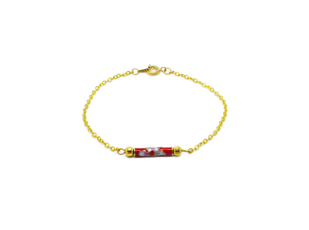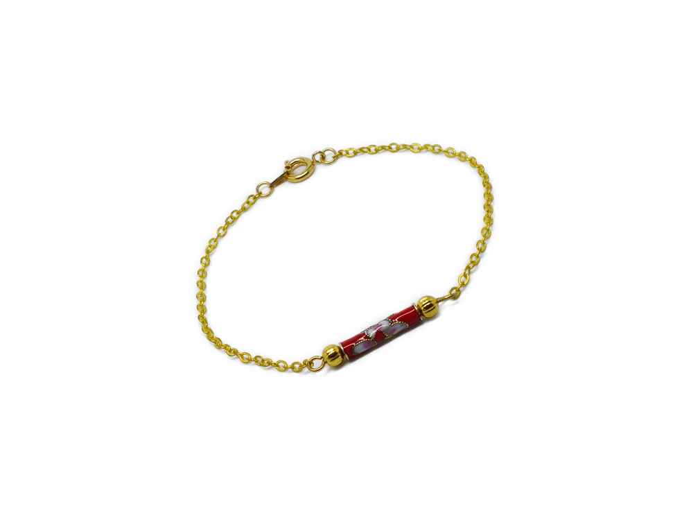 Bracelet chaine perle émaillée. Bracelet chaîne très fine dorée avec une petite perle tube émaillé rouge motif florale. Un petit air d’Asie à votre bras.