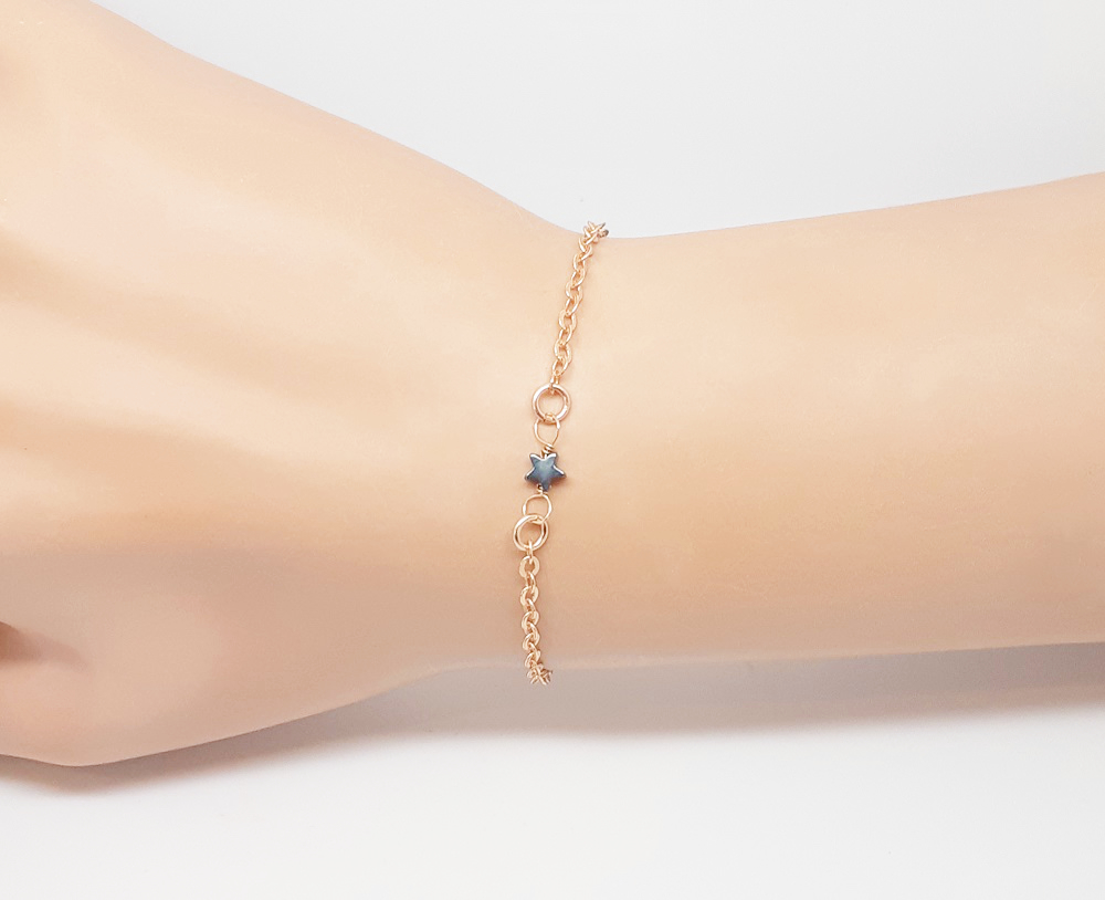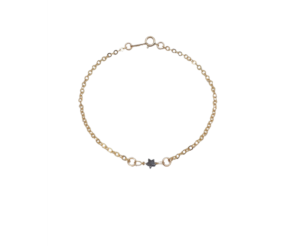 Ici c’est une étoile en hématite. Vous trouverez des informations dans la rubrique “nos pierres“. En option le bracelet avec une améthyste et une turquoise.
