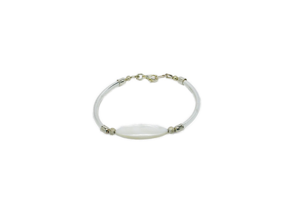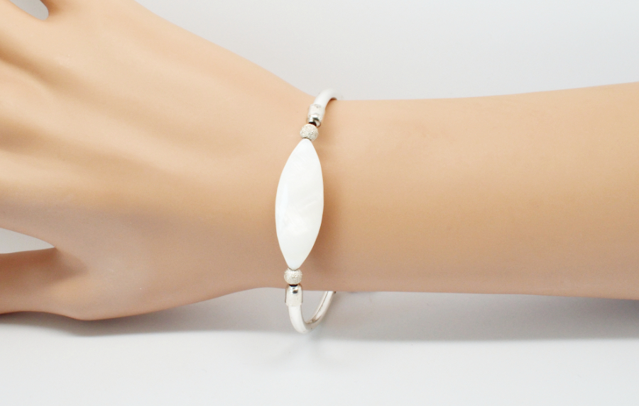 Bracelet très élégant, tour de poignet 17-18 cm plaqué argent avec un palet en nacre en forme d’œil de cheval de 30*10mm.
