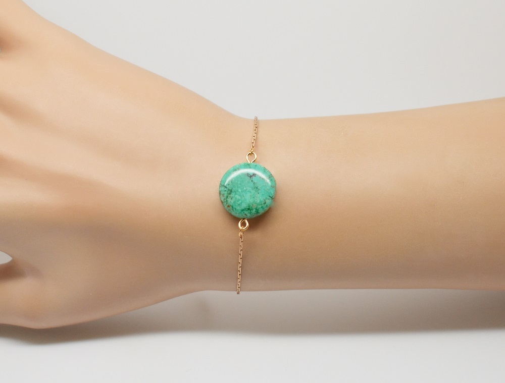 Bracelet laiton doré chaîne très fine et perle en pierre semi-précieuse, ici en turquoise, de 10mm suivant la pierre.