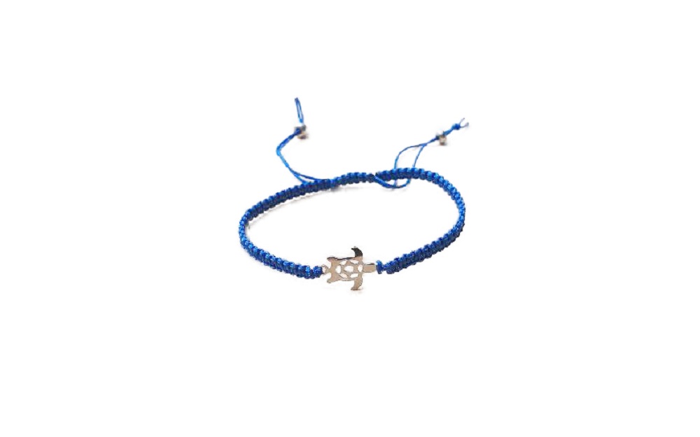 Bracelet fin en macramé de couleur bleu, avec un intercalaire tortue en acier inoxydable.