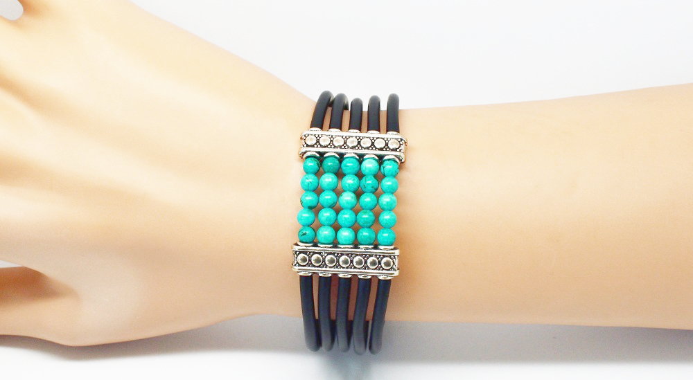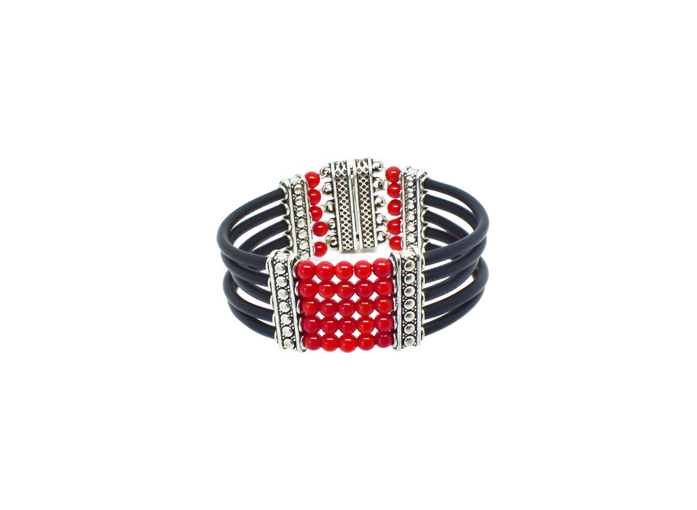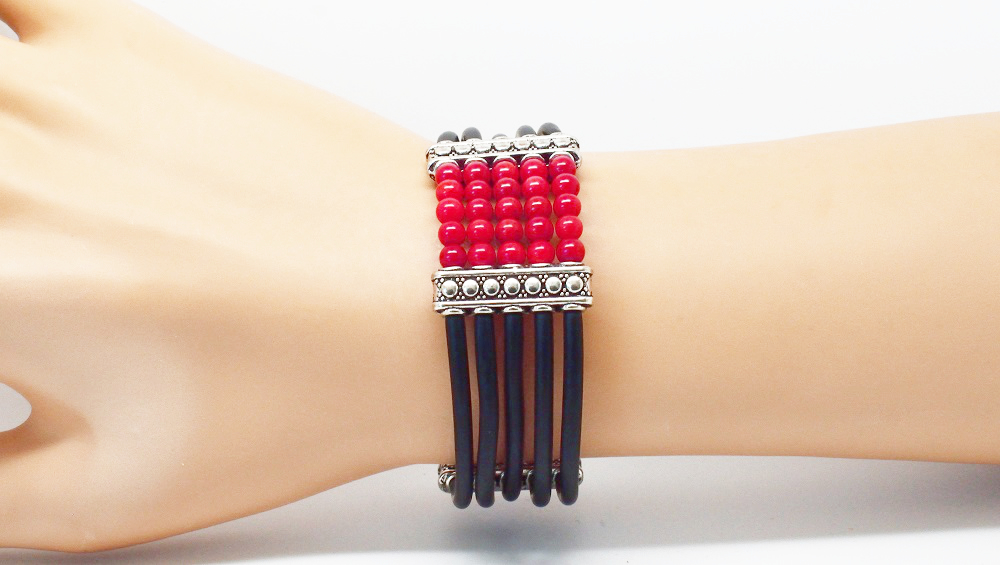 Ce bracelet manchette existe dans divers coloris comme le rouge (perles de corail) et en bleu (en perles turquoise)