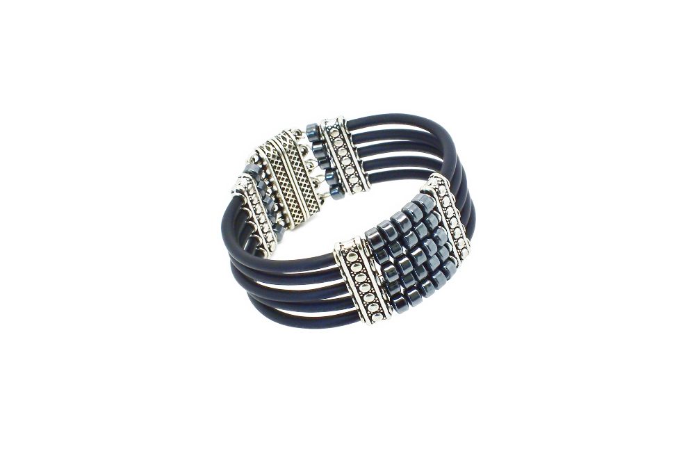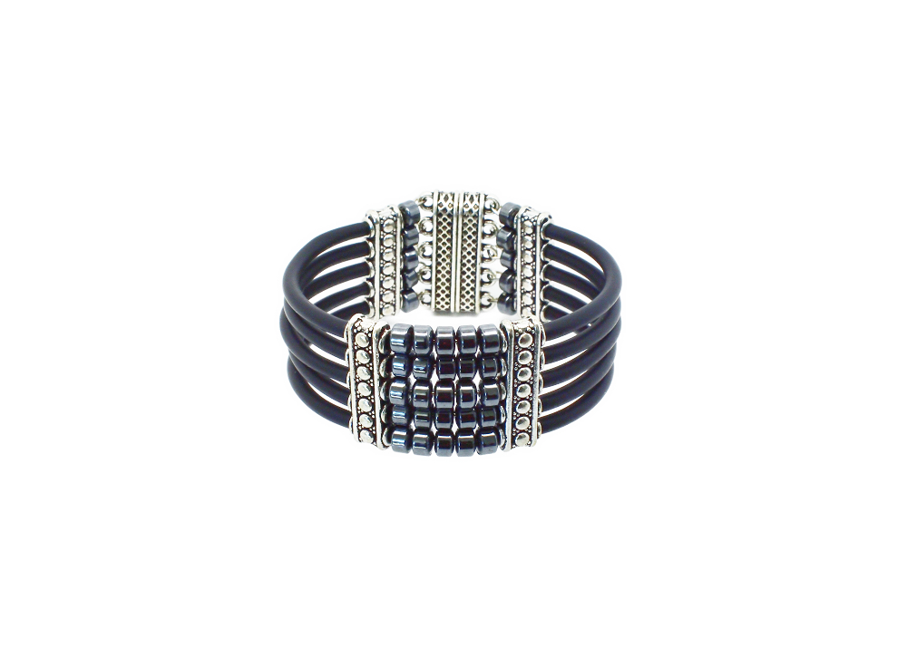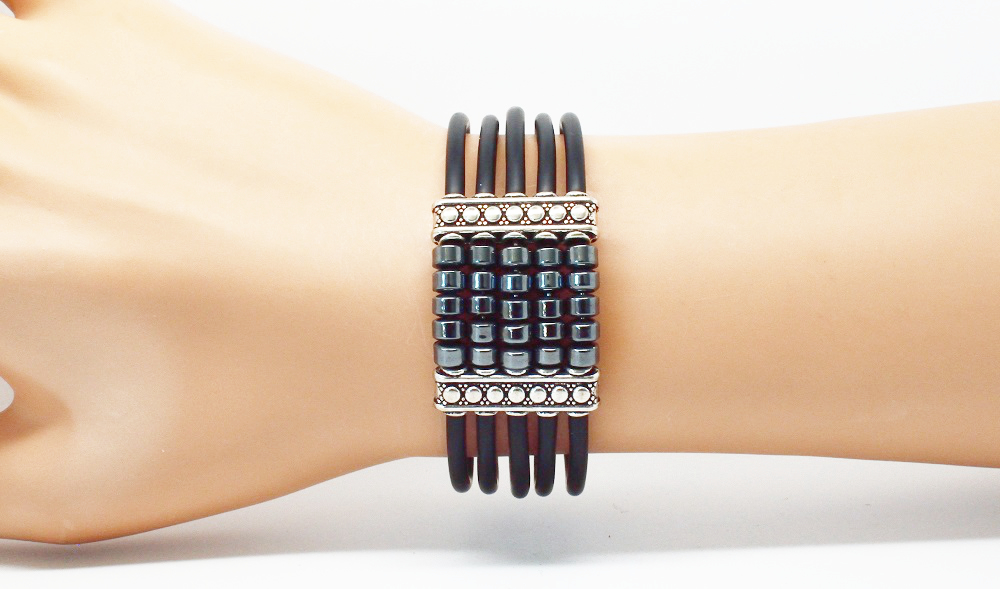 Bracelet manchette multirang, il est composé de perles hématite et silicone noir.
