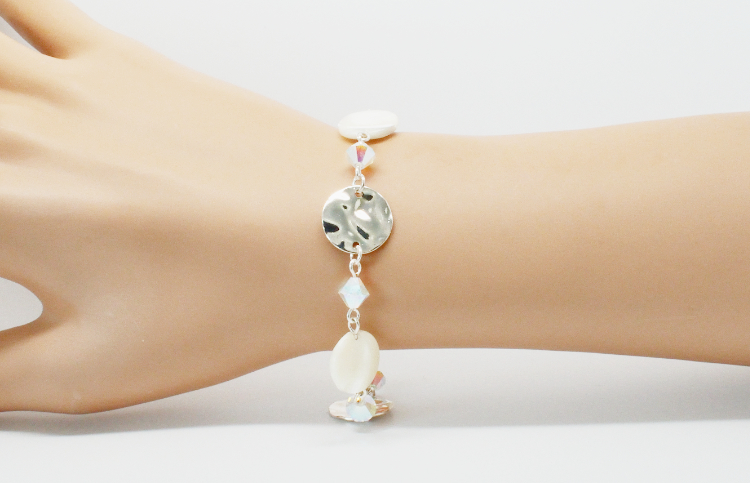 Bracelet plaqué argent est une alternance de perles de nacre, de pastille argentées martelées et perles Swarovski cristal AB (aurore boréale).