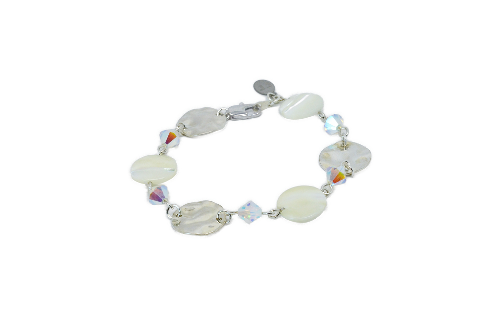 Très joli bracelet alternant pastilles argentées martelées, perles plates de nacre blanche  et toupies Swarovski, assorti au collier et aux boucles d’oreilles de la collection “Jolla” que vous retrouverez dans ma boutique.