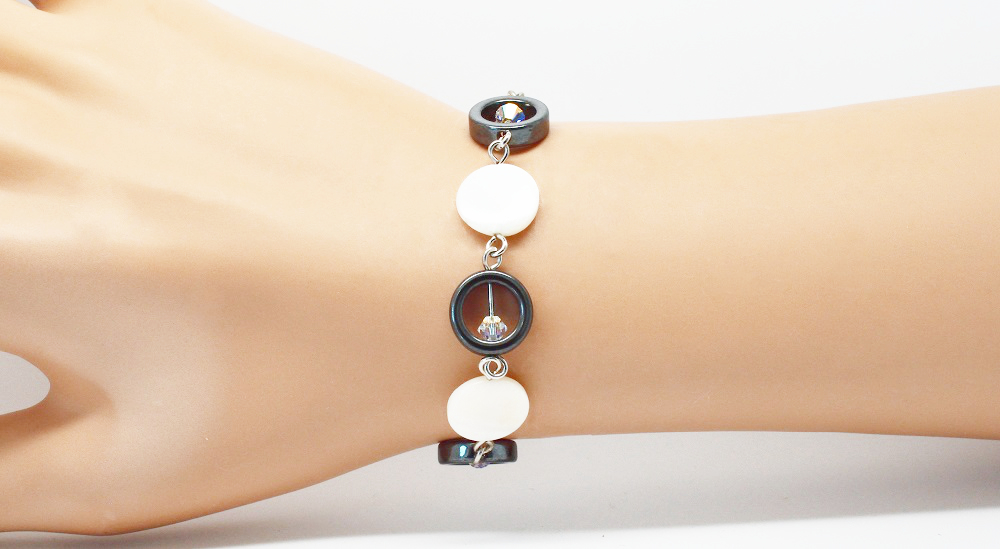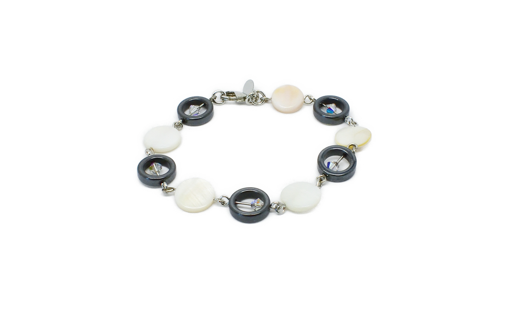 Très élégant bracelet plaqué argent alternant des pastilles de nacre, des anneaux en hématites et perles Swarovski pour le rendre plus lumineux