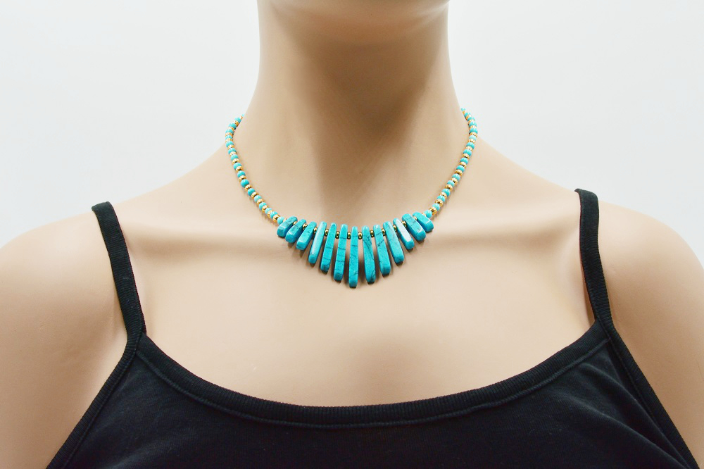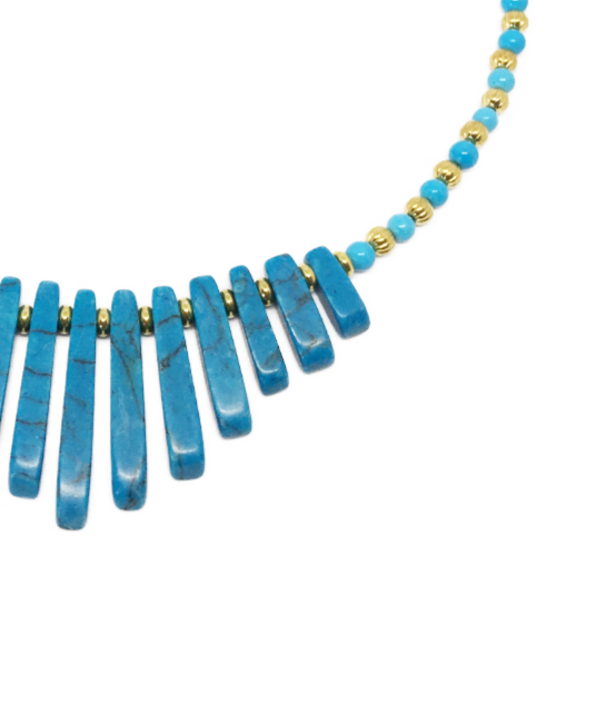 Collier plastron Égyptien en turquoise – Egyptian Turquoise – Collier en perles semi-précieuses turquoise reconstituée qui rappelle les plastrons Égyptiens et de jolies petites perles de 3 mm gold striées.