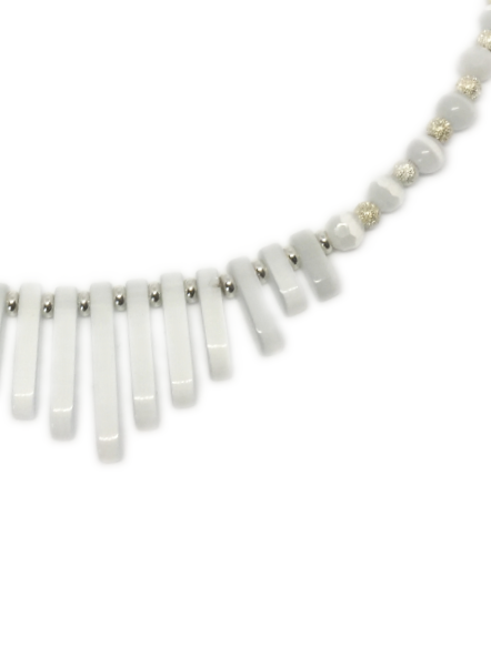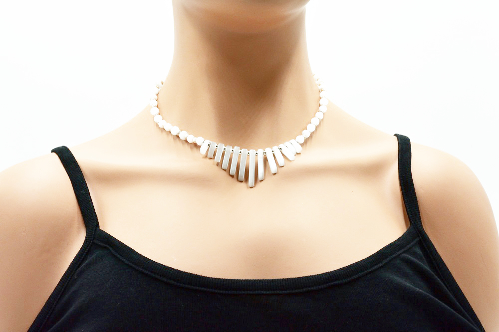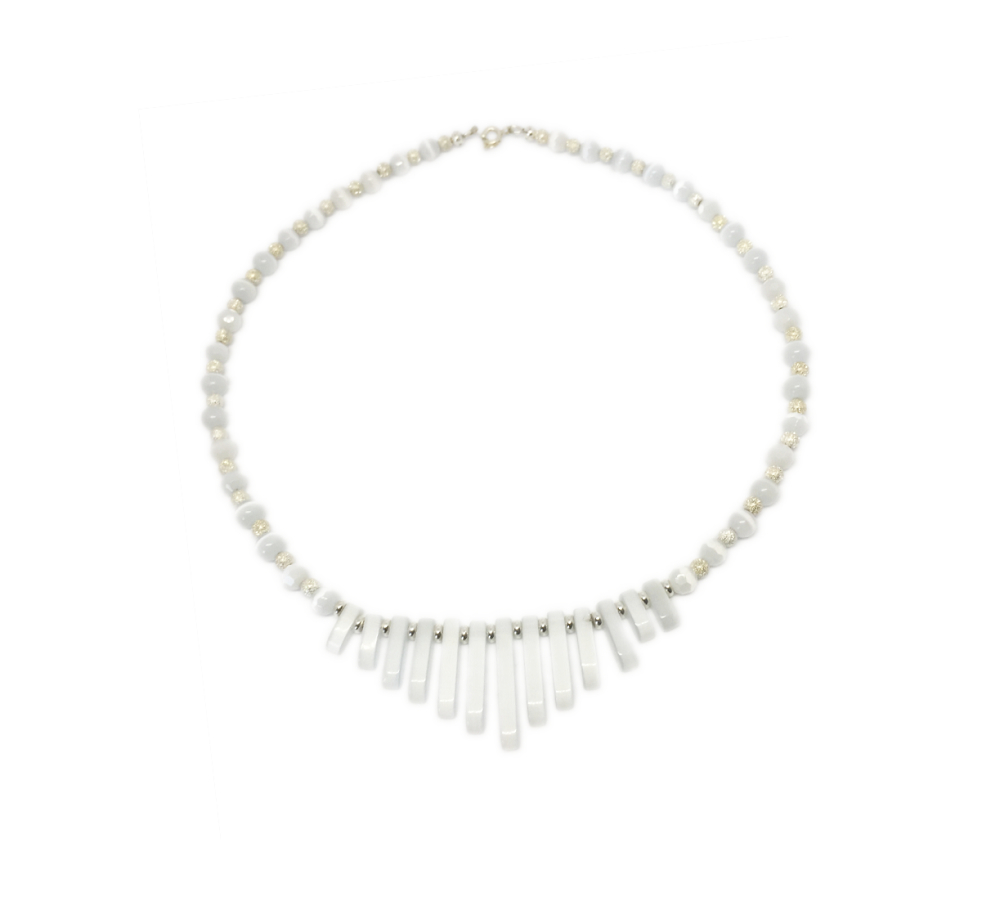 Collier plastron Egyptien verre œil de chat – Collection Egyptian – Ce collier est composé de perles de verre œil de chat blanc lisse et à facettes qui a des reflets changeants suivant la lumière et de perles en plaqué argent.