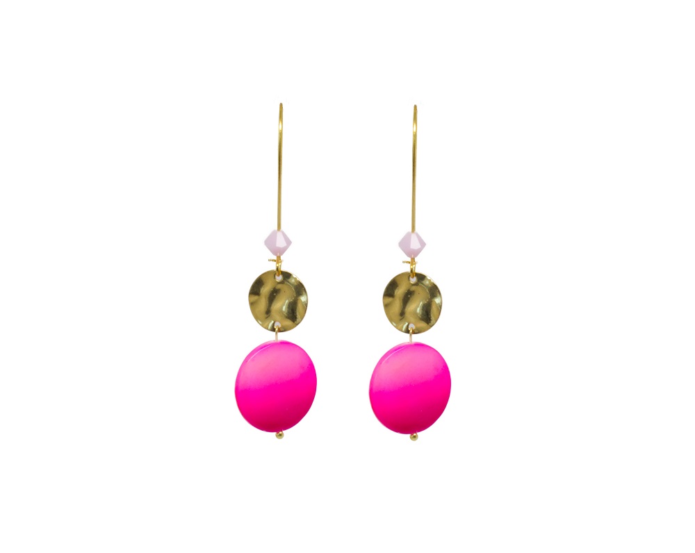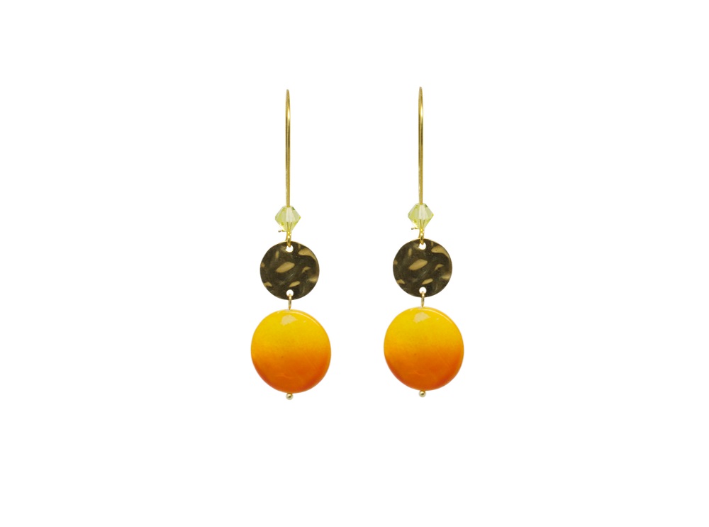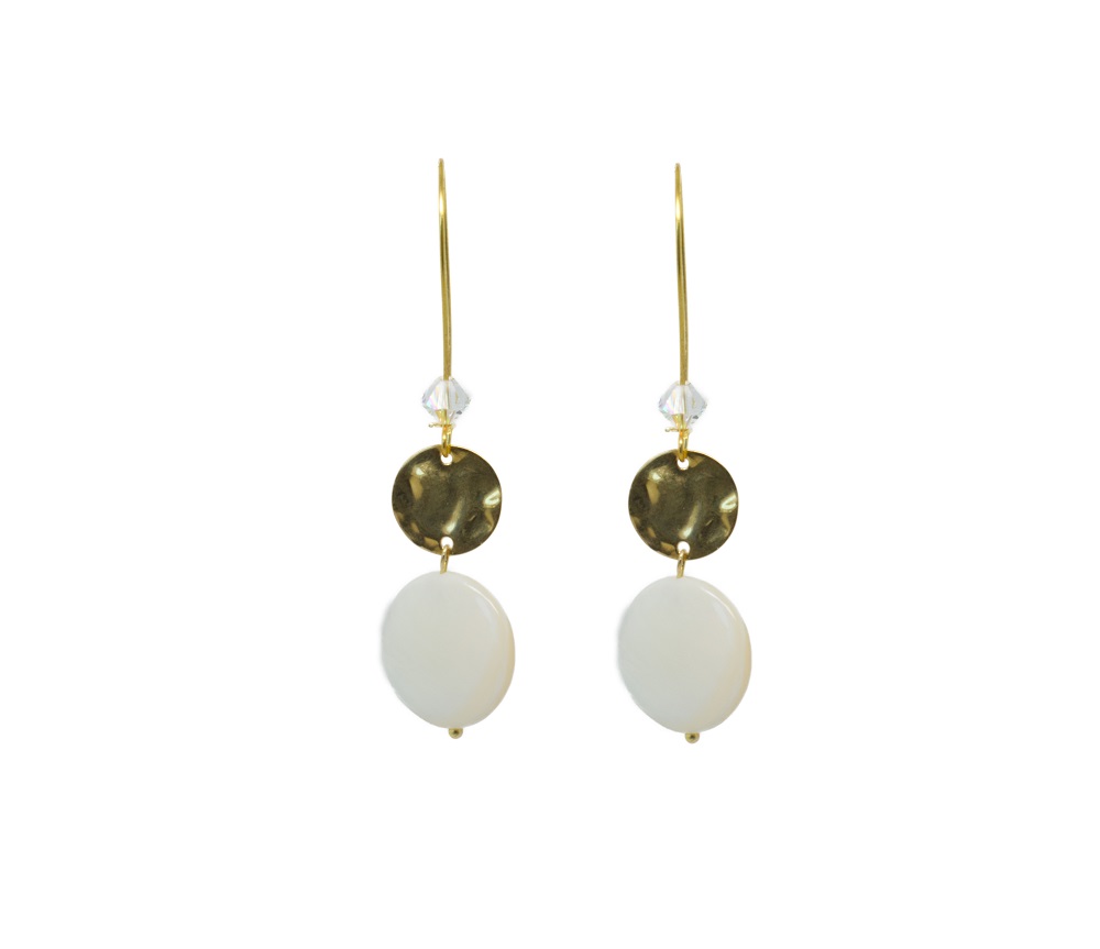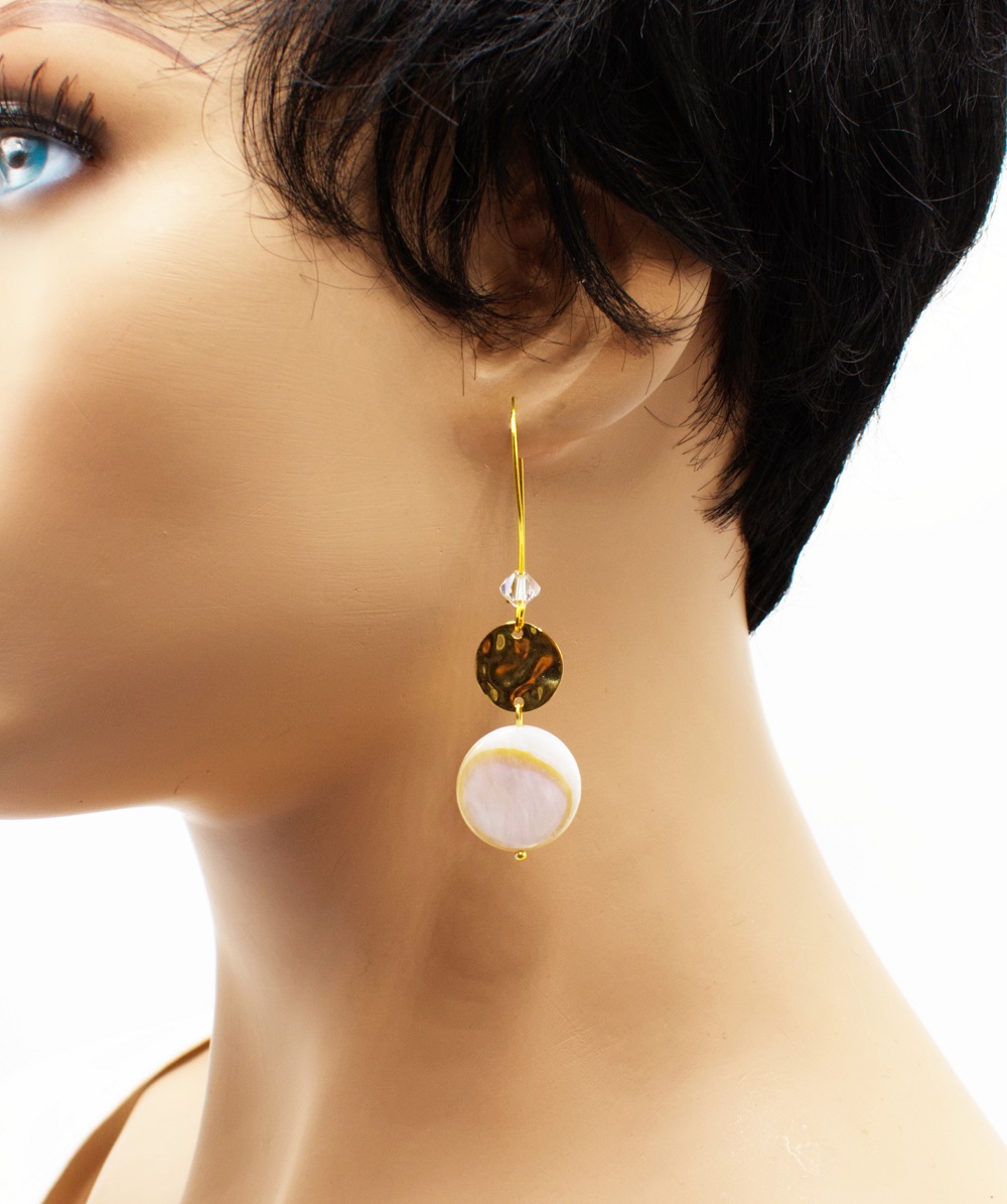 Boucles d’oreilles pendantes couleur dorée, avec un joli palet de nacre et une pastille dorée. Ces boucles sont indispensables pour égayer cet été que cela soit à la ville qu’en soirée.