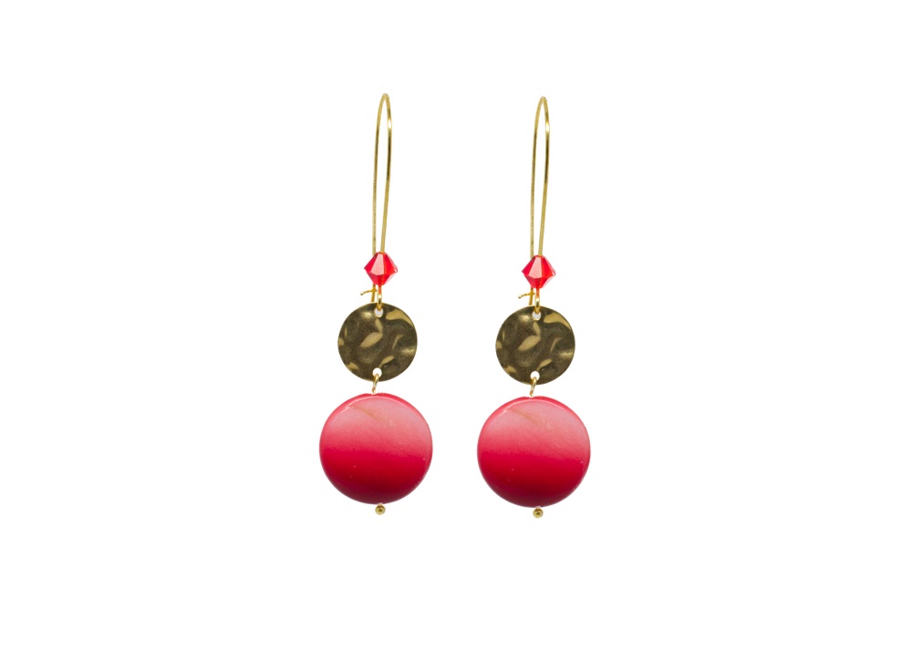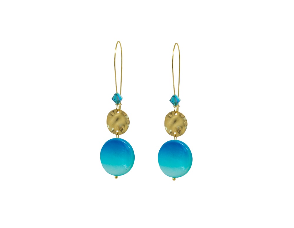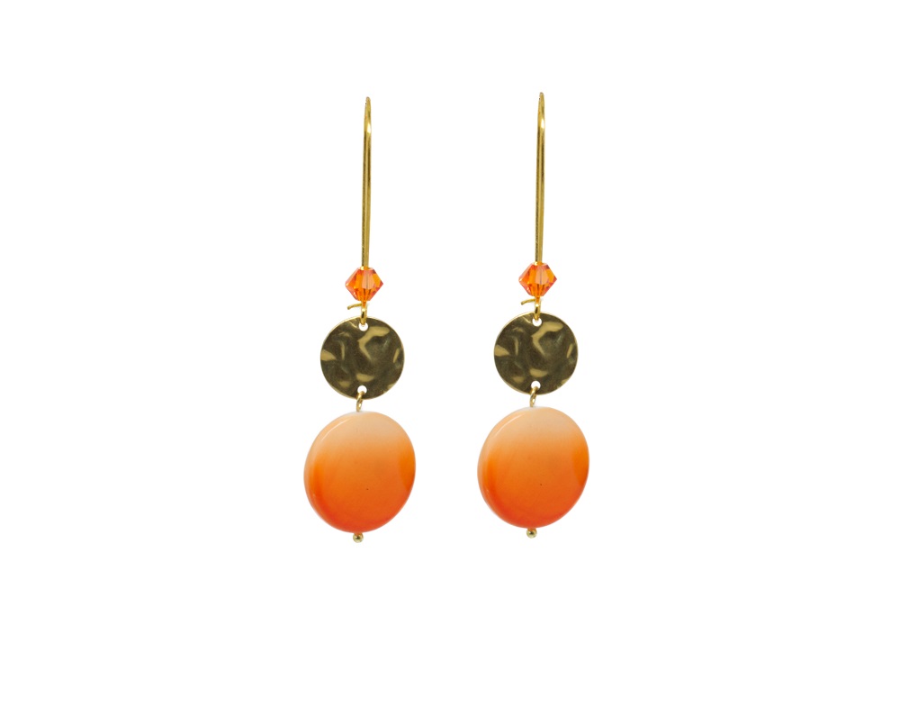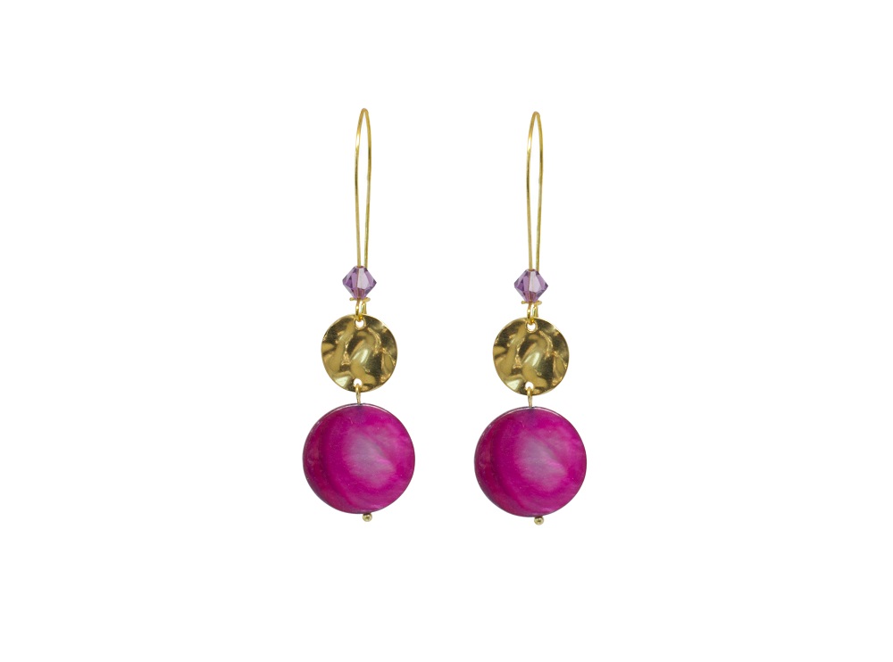 Boucles d’oreilles pendantes couleur dorée, avec un joli palet de nacre et une pastille dorée. Ces boucles sont indispensables pour égayer cet été que cela soit à la ville qu’en soirée.