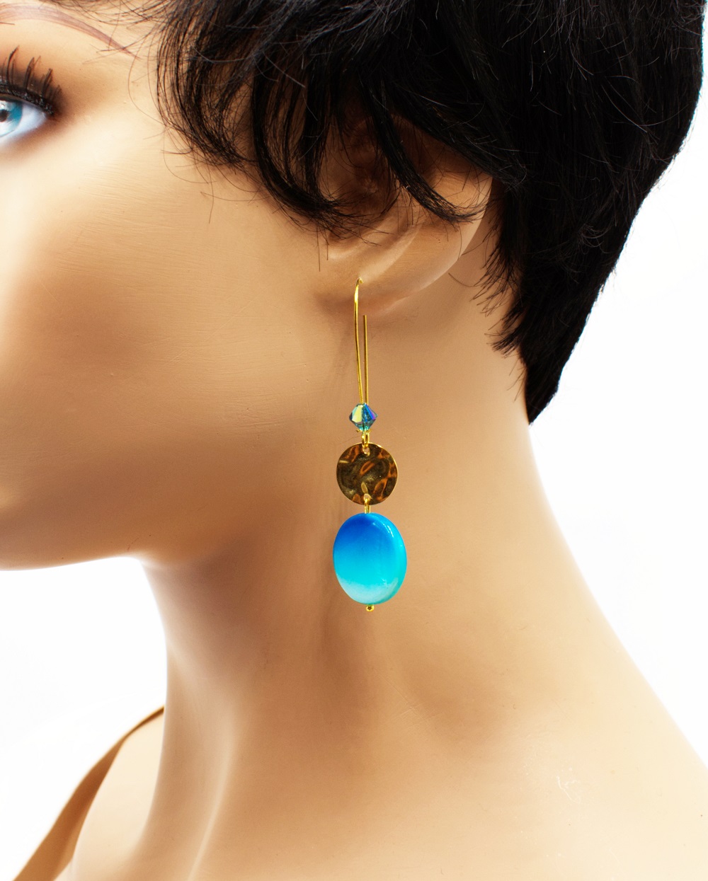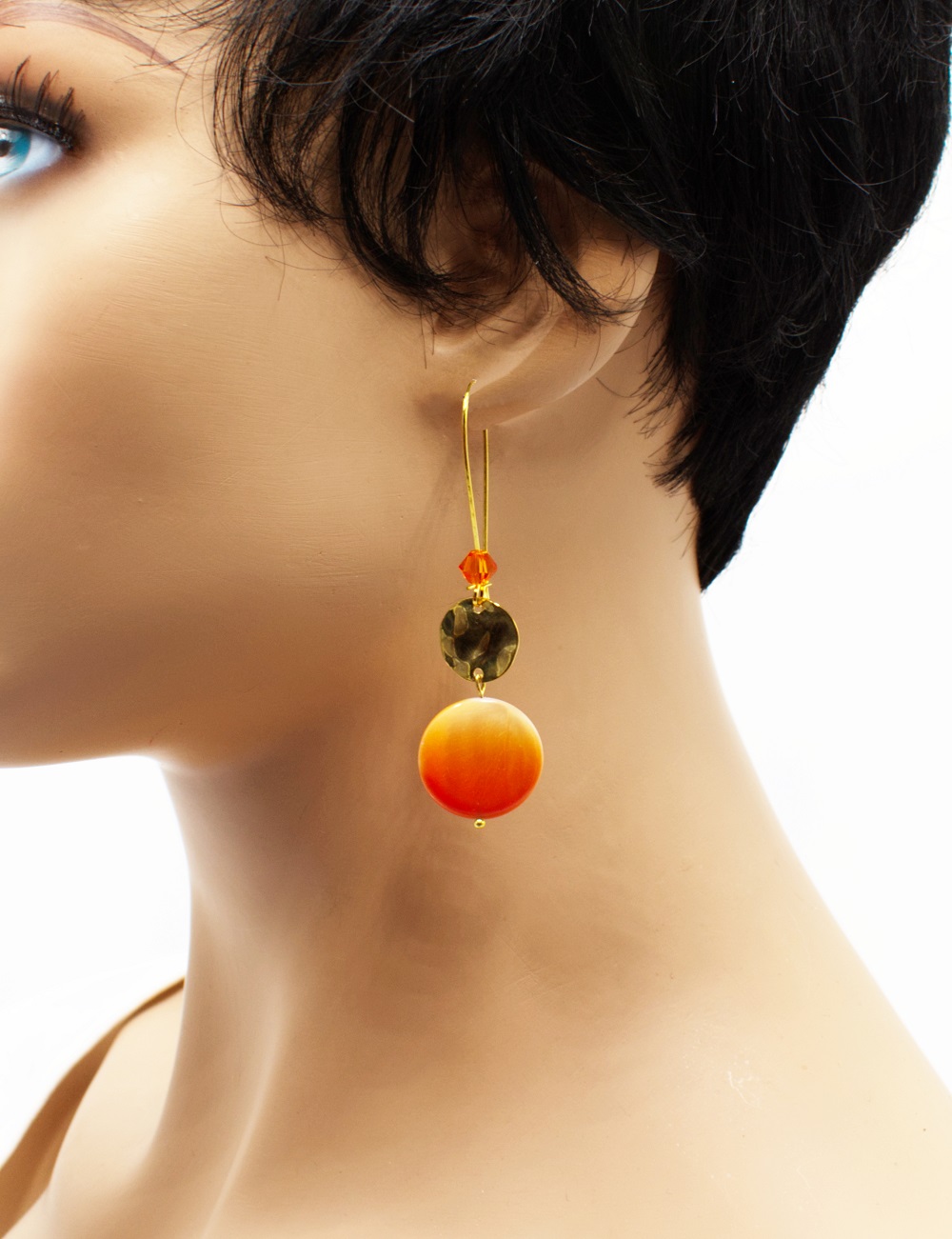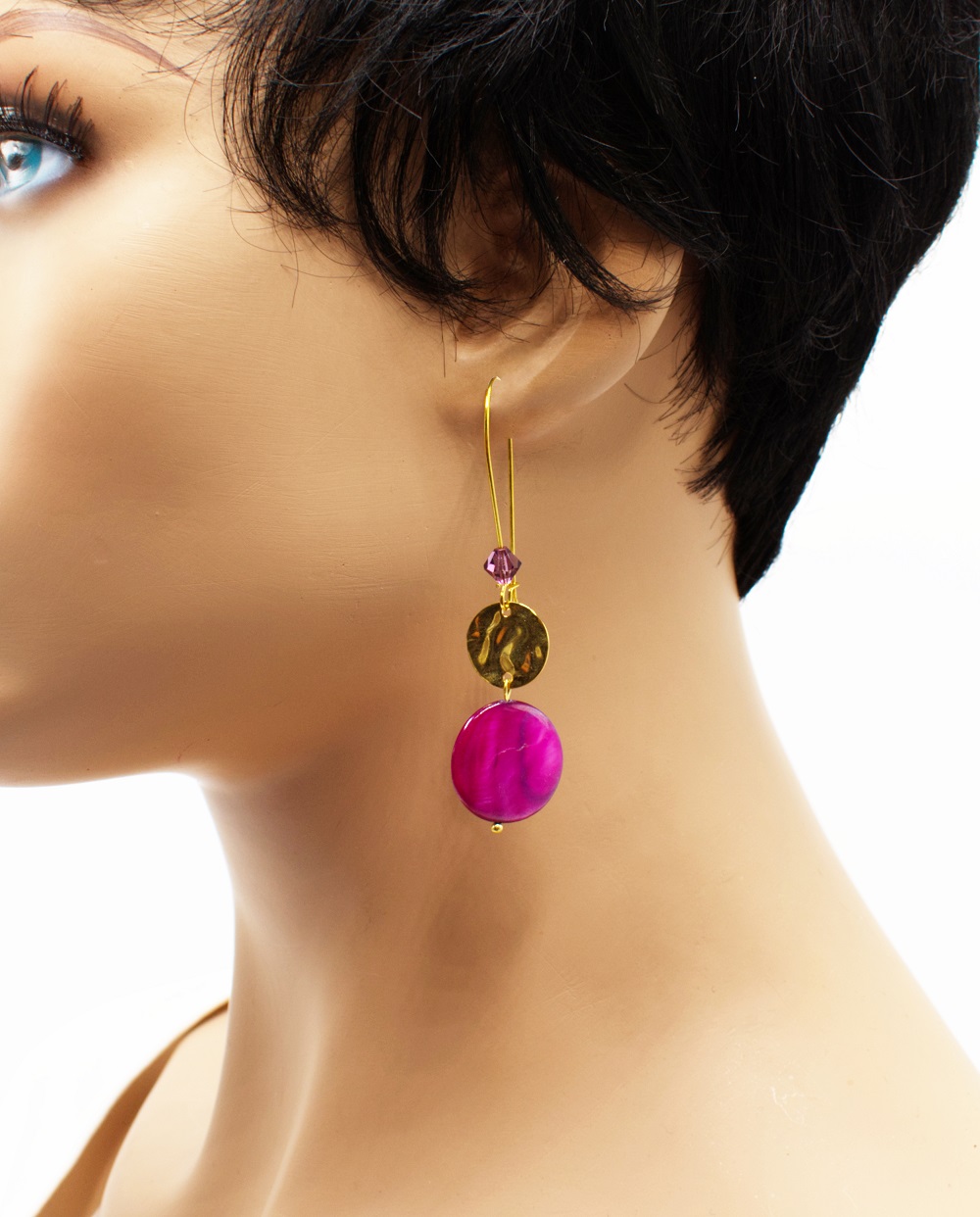 Crochet long doré palet de nacre peintes de divers coloris. Les perles sont de fins palets de nacre unis ou peintes de motifs zébrés, ainsi qu’une perle Swarovski assortie dans le long crochet d’oreille. Un voyage estival, un safari, une escapade, choisissez quelle aventure vous voulez.
