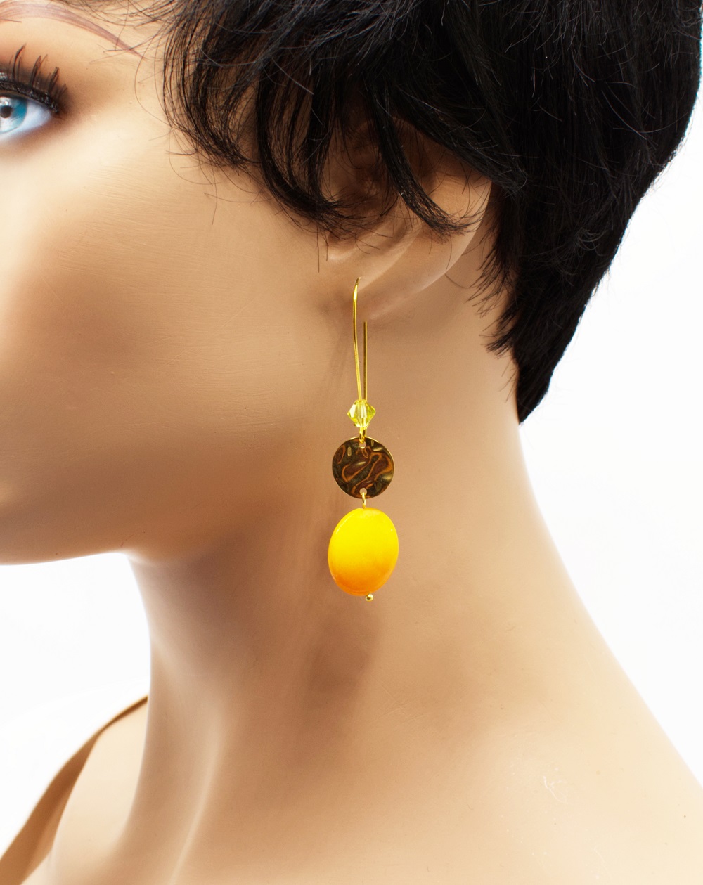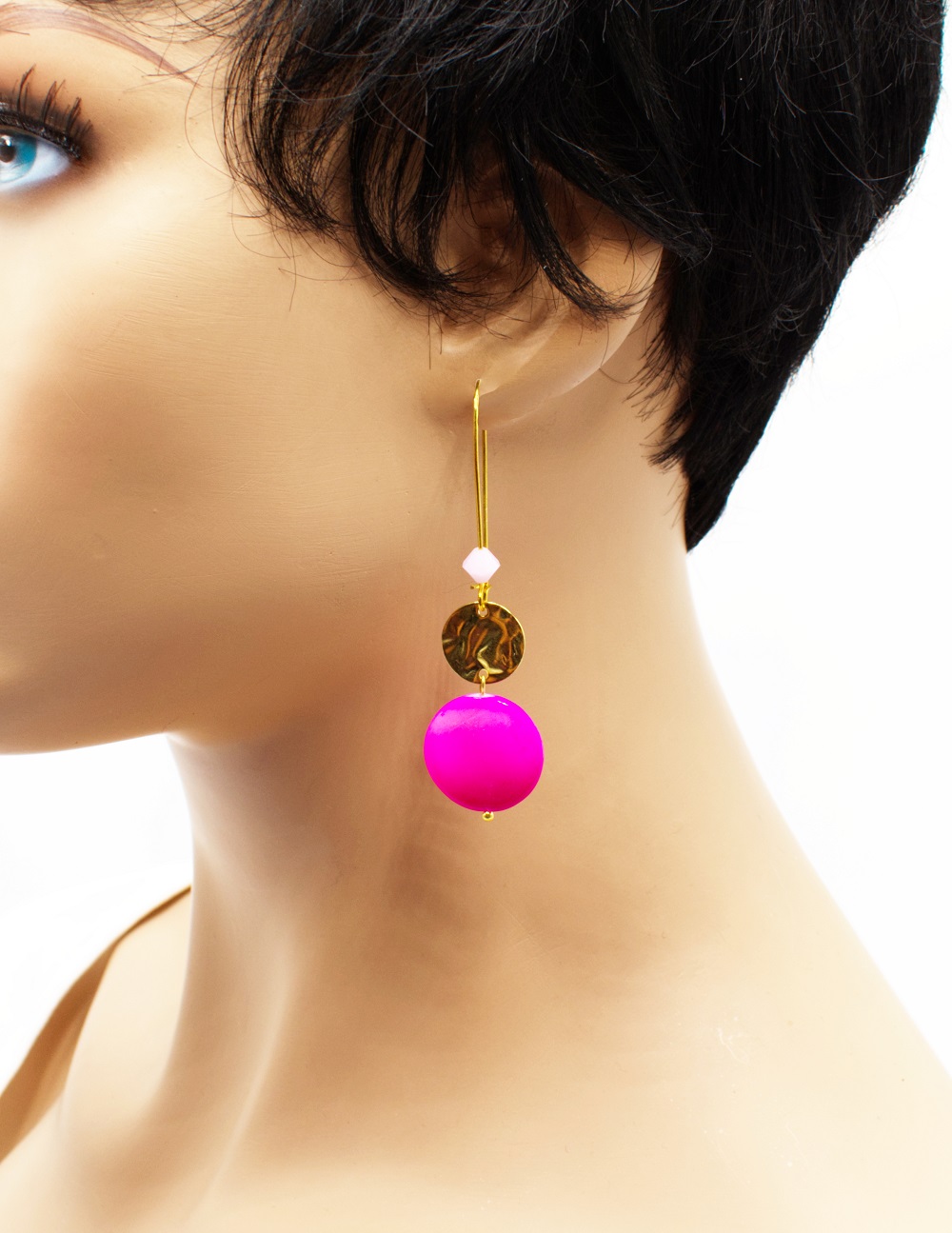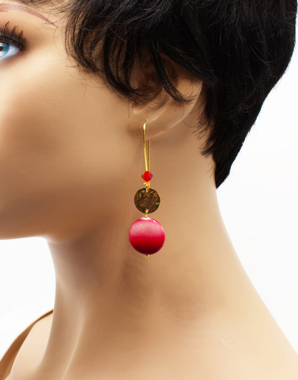 Crochet long doré palet de nacre peintes de divers coloris. Les perles sont de fins palets de nacre unis ou peintes de motifs zébrés, ainsi qu’une perle Swarovski assortie dans le long crochet d’oreille. Un voyage estival, un safari, une escapade, choisissez quelle aventure vous voulez.