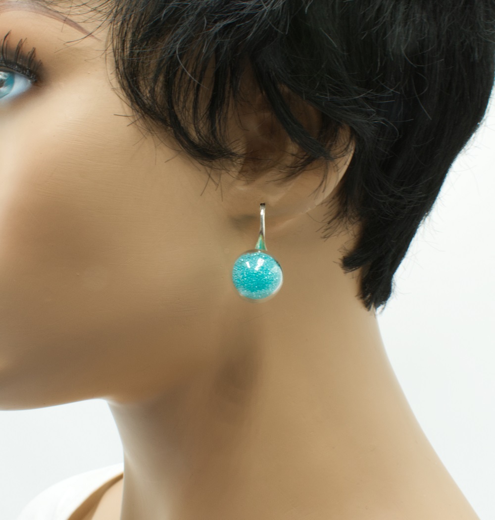 Crochets d’oreilles globe en verre, en forme de cuillère recourbée argent. Surmontée d’une bulle de verre soufflé artisanalement de 16 mm, remplie de micro-bille de couleur, ici au choix vert tendre, bleu turquoise et café crème. La bulle de verre semble suspendue sur la cuillère, l’effet est impressionnant.