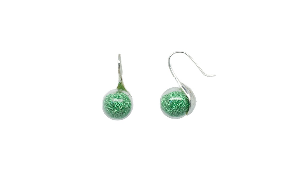 Très originales boucles d’oreilles en forme de cuillère rehaussées d’un globe de verre soufflé rempli de micro bille de couleur.