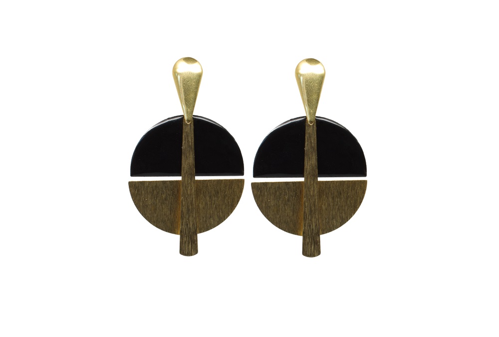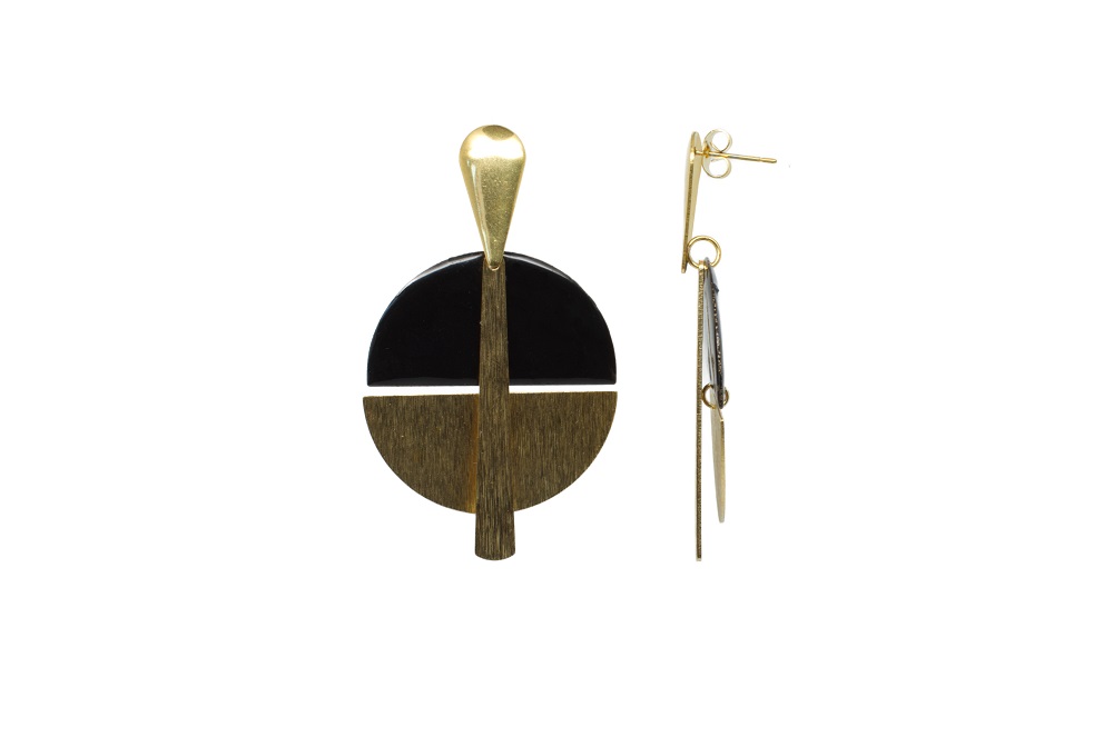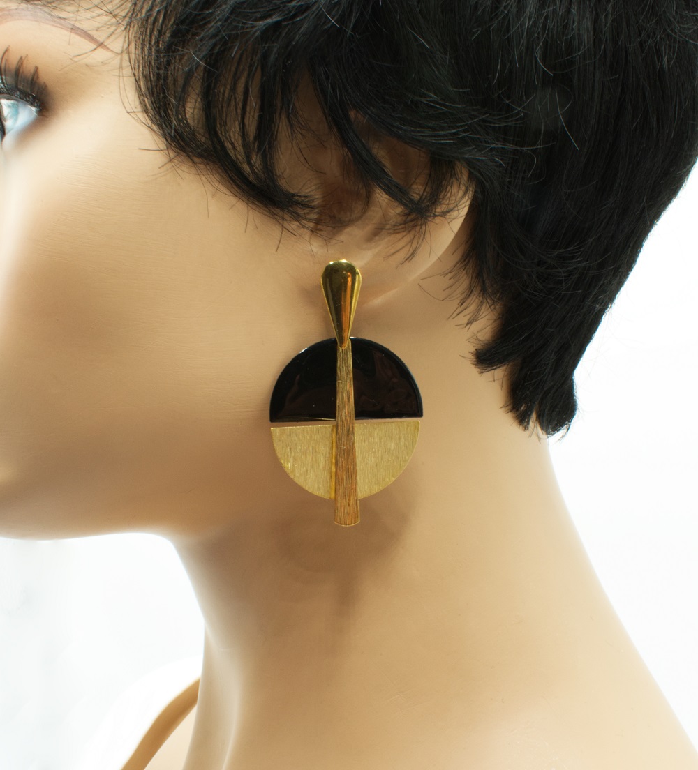 Boucles d’oreilles puces gouttes or.  Ces boucles d’oreilles font parties de la collection géométrique. Très originales, avec un mélange de matières et aussi de formes.  Les matériaux sélectionnés sont un mariage d’acier et de laiton texturé doré et émaillage. Ici dans les tons noir et or. Vous trouverez d’autres modèles ici.