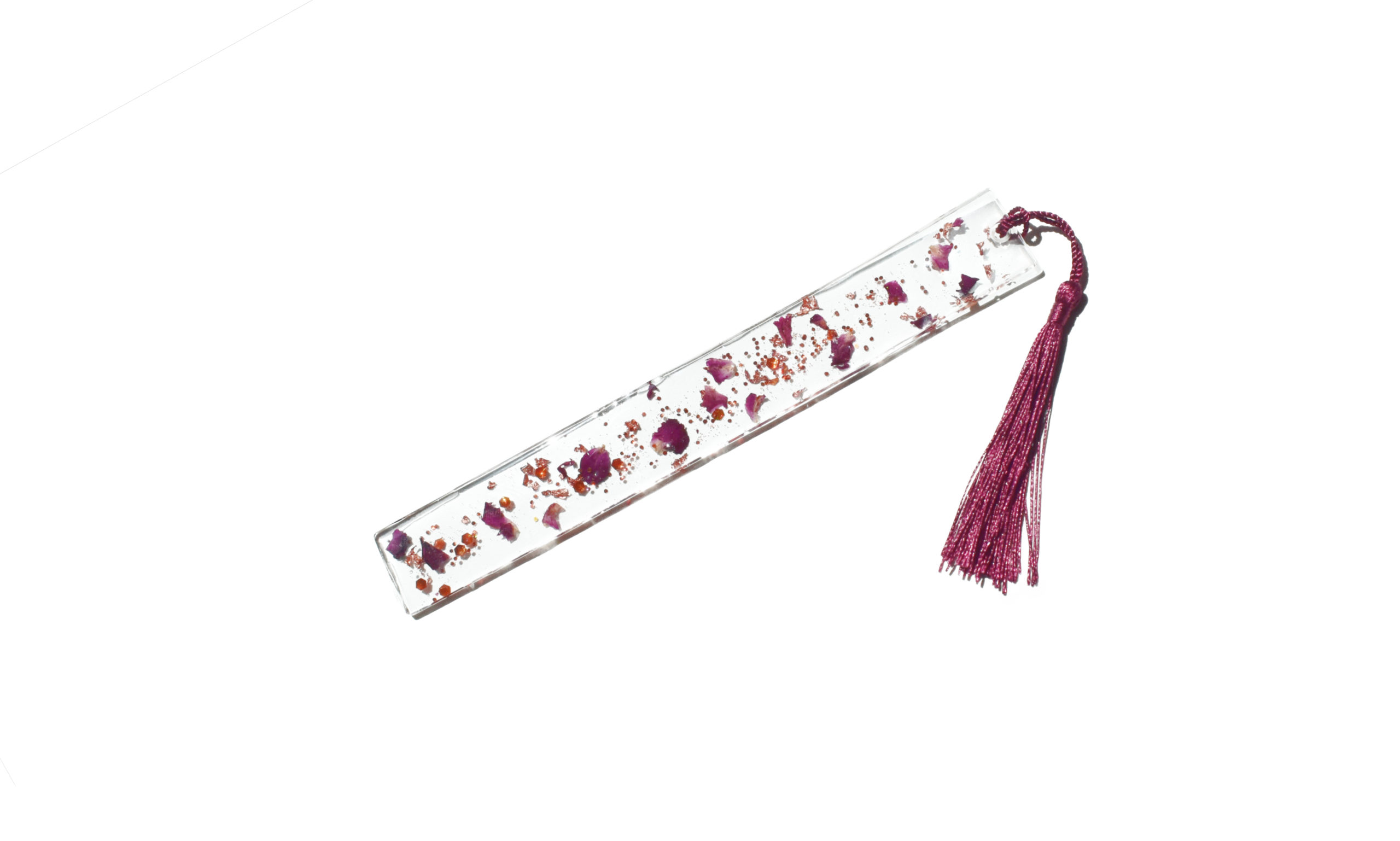 Marque page résine pétales de rose réalisé en résine avec des inclusions de pétales de rose séchées et des chunky glitter cuivre. Chaque marque page est unique car fait main en résine.