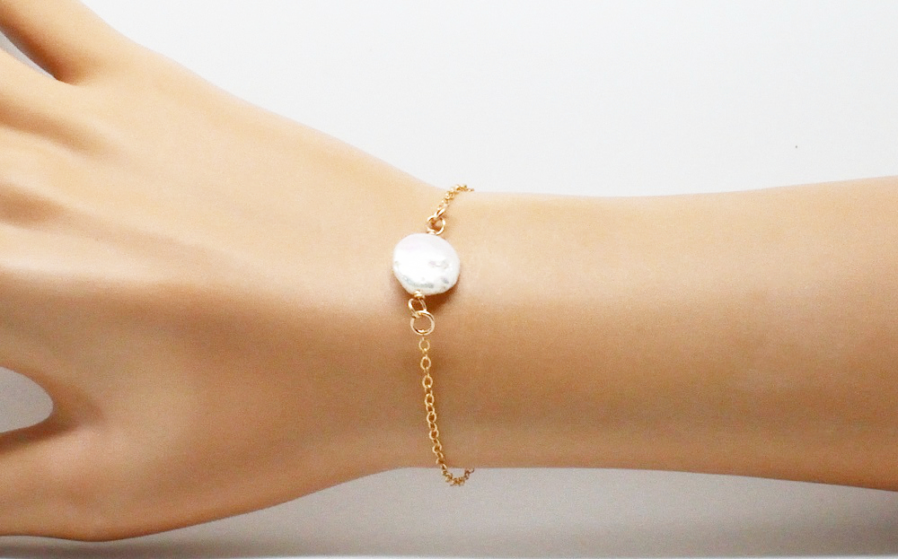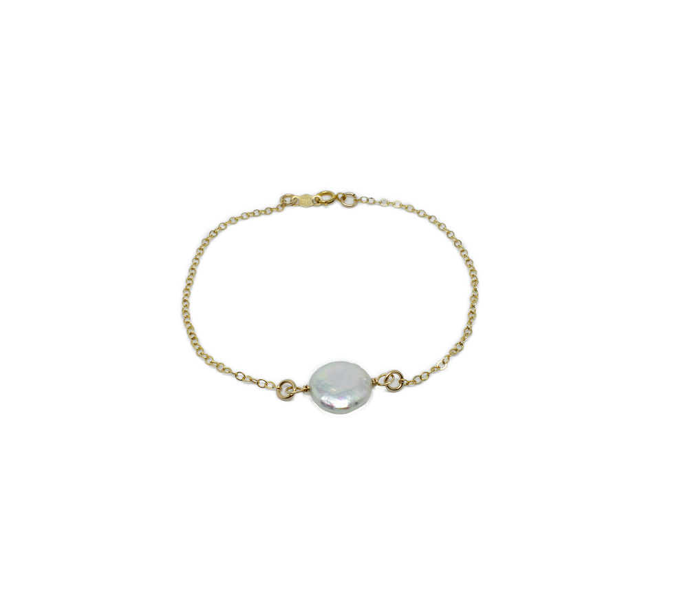 Bracelet perle de culture plate. Bracelet chaîne très fine gold filled et petite perle de culture plate.