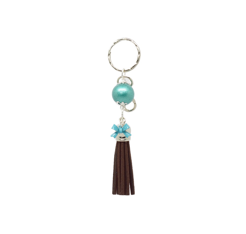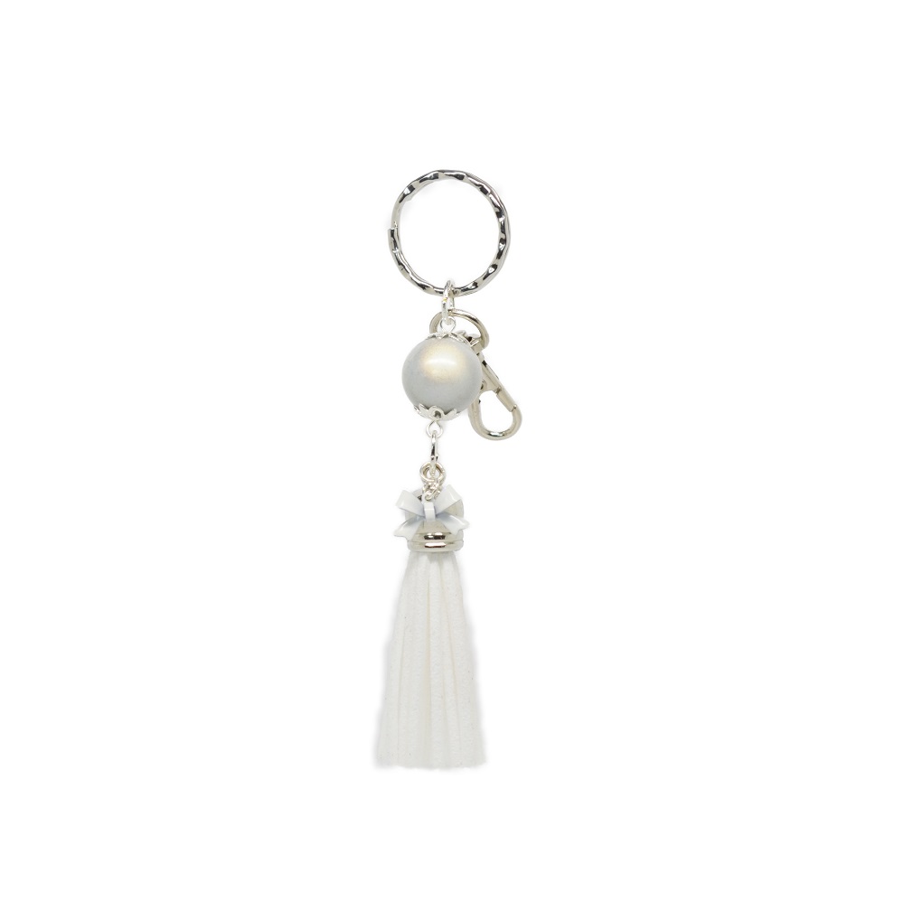 Porte-clés argenté nœud et pompon, composé d’un grand fermoir poisson pivotant à 360° pour l’accrocher à votre sac, d’un anneau double pour y mettre vos clés, une grosse perle magique et un pompon à frange décoratif en suédine de couleur à assortir au gré de vos envies.